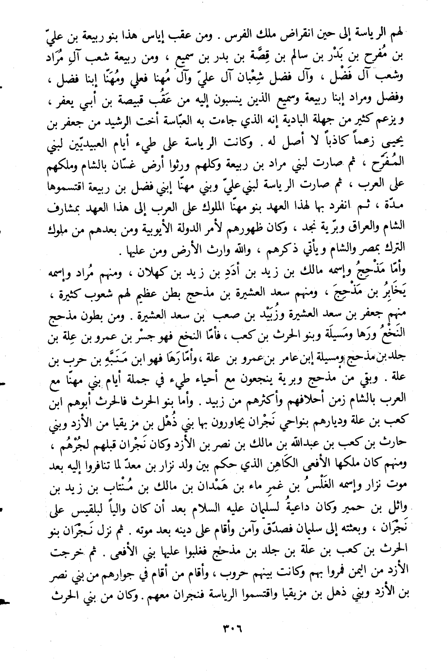 وأمّا مذحج واسمه مالك بن زيد بن أدد بن زيد بن كهلان، ومنهم مراد واسمه يخابر بن مذحج، ومنهم سعد العشيرة بن مذحج بطن عظيم لهم شعوب كثيرة، منهم جعفر بن سعد العشيرة وزبيد بن صعب بن سعيد العشيرة. ومن بطون مذحج النخع ورها ومسيلة وبنو الحرث بن كعب، فأمّا النخع فهو جسر بن عمرو بن علة بن جلد بن مذحج ومسيلة ابن عامر بن عمرو بن علة، وأمّارها فهو ابن منبّه بن حرب بن علة. وبقي من مذحج وبرية ينجعون مع أحياء طيِّئ في جملة أيام بني مهنّا مع العرب بالشام زمن أحلافهم وأكثرهم من زبيد. وأما بنو الحرث فالحرث أبوهم ابن كعب بن علة وديارهم بنواحي نجران يجاورون بها بني ذهل بن مزيقياء من الأزد وبني حارث بن كعب بن عبد الله بن مالك بن نصر بن الأزد وكان نجران قبلهم لجرهم، ومنهم كان ملكها الأفعى الكاهن الّذي حكم بين ولد نزار بن معدّ لما تنافروا إليه بعد موت نزار واسمه الغلس بن غمر ماء بن همدان بن مالك بن منتاب بن زيد بن واثل بن حمير وكان داعية لسليمان عليه السلام بعد أن كان واليا لبلقيس على نجران، وبعثته إلى سليمان فصدّق وآمن وأقام على دينه بعد موته. ثم نزل نجران بنو الحرث بن كعب بن علة بن جلد بن مذحج فغلبوا عليها بني الأفعى. ثم خرجت الأزد من اليمن فمروا بهم وكانت بينهم حروب، وأقام من أقام في جوارهم من بني نصر بن الأزد وبني ذهل بن مزيقياء واقتسموا الرئاسة فنجران معهم. وكان من بني الحرث