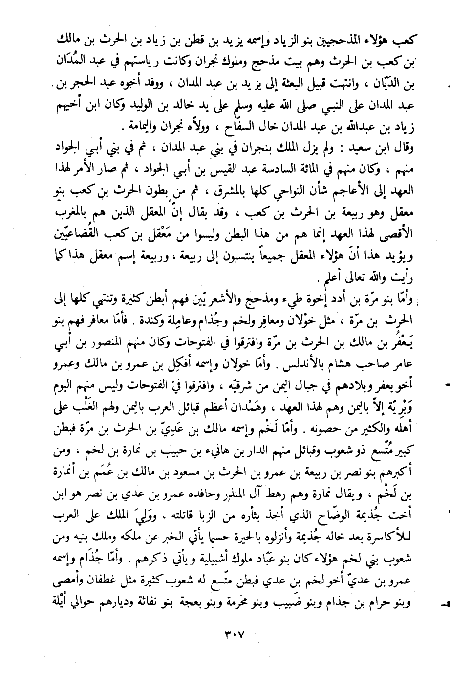 وأمّا بنو مرّة بن أدد إخوة طيِّئ ومذحج والأشعريّين فهم أبطن كثيرة وتنتهي كلها إلى الحرث بن مرّة، مثل خولان ومعافر ولخم وجذام وعاملة وكندة. فأمّا معافر فهم بنو يعفر بن مالك بن الحرث بن مرّة وافترقوا في الفتوحات وكان منهم المنصور بن أبي عامر صاحب هشام بالأندلس. وأمّا خولان واسمه أفكل بن عمرو بن مالك وعمرو أخو يعفر وبلادهم في جبال اليمن من شرقيّه، وافترقوا في الفتوحات وليس منهم اليوم وبريّة إلّا باليمن وهم لهذا العهد، وهمدان أعظم قبائل العرب باليمن ولهم الغلب على أهله والكثير من حصونه. وأمّا لخم واسمه مالك بن عديّ بن الحرث بن مرّة فبطن كبير متّسع ذو شعوب وقبائل منهم الدار بن هانئ بن حبيب بن نمارة بن لخم، ومن أكبرهم بنو نصر بن ربيعة بن عمرو بن الحرث بن مسعود بن مالك بن عمم بن أنمارة بن لخم، ويقال نمارة وهم رهط آل المنذر وحافده عمرو بن عدي بن نصر هو ابن أخت جذيمة الوضّاح الّذي أخذ بثأره من الزبا قاتلته، وولي الملك على العرب للأكاسرة بعد خاله جذيمة وأنزلوه بالحيرة حسبما يأتي الخبر عن ملكه وملك بنيه ومن شعوب بني لخم هؤلاء كان بنو عبّاد ملوك إشبيليّة ويأتي ذكرهم. وأمّا جذام واسمه عمرو بن عديّ أخو لخم بن عدي فبطن متّسع له شعوب كثيرة مثل غطفان وأمصى وبنو حرام بن جذام وبنو ضبيب وبنو مخرمة وبنو بعجة بنو نفاثة وديارهم حوالي أيلة