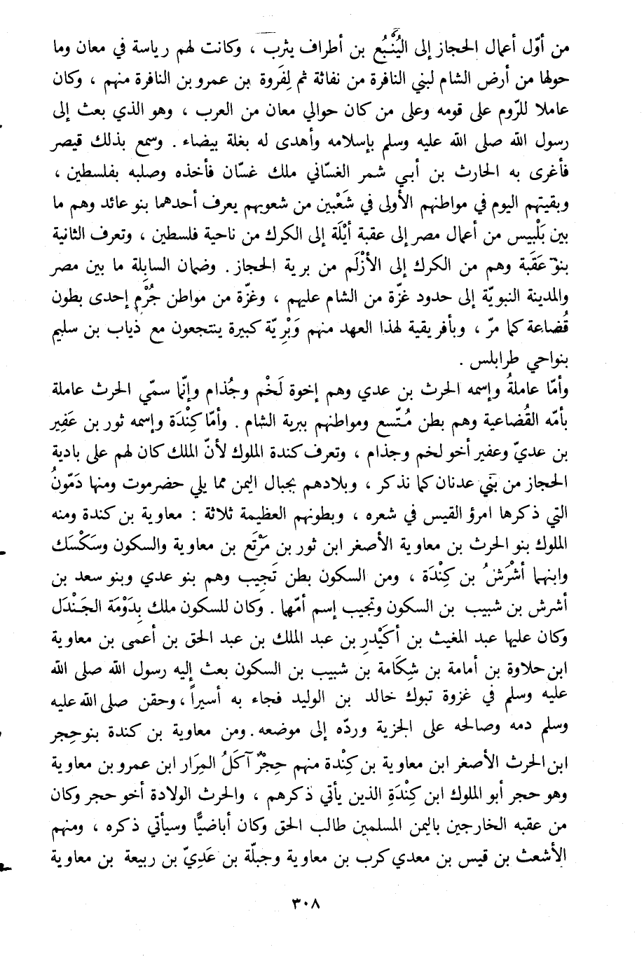 وأمّا عاملة واسمه الحرث بن عدي وهم إخوة لخم وجذام وإنّما سمّي الحرث عاملة بأمّه القضاعية وهم بطن متّسع ومواطنهم ببرية الشام. وأمّا كندة واسمه ثور بن عفير بن عديّ وعفير أخو لخم وجذام، وتعرف كندة الملوك لأنّ الملك كان لهم على بادية الحجاز من بني عدنان كما نذكر، وبلادهم بجبال اليمن مما يلي حضرموت ومنها دمّون التي ذكرها امرؤ القيس في شعره، وبطونهم العظيمة ثلاثة: معاوية بن كندة ومنه الملوك بنو الحرث بن معاوية الأصغر ابن ثور بن مرتع بن معاوية والسكون وسكسك وابنهما أشرش بن كندة، ومن السكون بطن تجيب وهم بنو عدي وبنو سعد بن أشرش بن شبيب بن السكون وتجيب اسم أمّهما. وكان للسكون ملك بدومة الجندل وكان عليها عبد المغيث بن أكيدر بن عبد الملك بن عبد الحق بن أعمى بن معاوية ابن حلاوة بن أمامة بن شكامة بن شبيب بن السكون بعث إليه رسول الله صلى الله عليه وسلم في غزوة تبوك خالد بن الوليد فجاء به أسيرا، وحقن صلى الله عليه وسلم دمه وصالحه على الجزية وردّه إلى موضعه. ومن معاوية بن كندة بنو حجر ابن الحرث الأصغر ابن معاوية بن كندة منهم حجر آكل المرار ابن عمرو بن معاوية وهو حجر أبو الملوك ابن كندة الذين يأتي ذكرهم، والحرث الولادة أخو حجر وكان من عقبه الخارجين باليمن المسلمين طالب الحق وكان أباضيّا وسيأتي ذكره، ومنهم الأشعث بن قيس بن معديكرب بن معاوية وجبلّة بن عديّ بن ربيعة بن معاوية