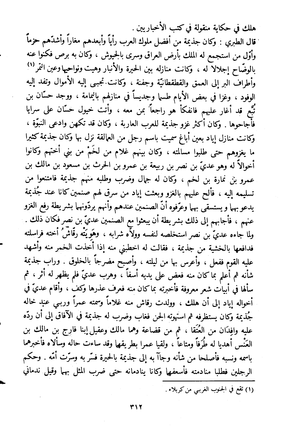 قال الطبري: وكان جذيمة من أفضل ملوك العرب رأيا وأبعدهم مغارا وأشدّهم حزما وأوّل من استجمع له الملك بأرض العراق وسرى بالجيوش، وكان به برص فكنوا عنه بالوضّاح إجلالا له، وكانت منازله بين الحيرة والأنبار وهيت ونواحيها وعين التمر [1] وأطراف البر إلى العمى والقطقطانيّة وجفنة، وكانت تجبى إليه الأموال وتفد إليه الوفود، وغزا في بعض الأيام طسما وجديسا في منازلهم باليمامة، ووجد حسّان بن تبّع قد أغار عليهم فانفكأ هو راجعا بمن معه، وأتت خيول حسّان على سرايا فأجاحوها. وكان أكثر غزو جذيمة للعرب العاربة، وكان قد تكهن وادعى النبوّة، وكانت منازل إياد بعين أباغ سميت باسم رجل من العمالقة نزل بها وكان جذيمة كثيرا ما يغزوهم حتى طلبوا مسالمته، وكان بينهم غلام من لخم من بني أختهم وكانوا أخوالا له وهو عديّ بن نصر بن ربيعة بن عمرو بن الحرث بن مسعود بن مالك بن عمرو بن نمارة بن لخم، وكان له جمال وضرب وطلبه منهم جذيمة فامتنعوا من تسليمه إليه، فألح عليهم بالغزو وبعثت إياد من سرق لهم صنمين كانا عند جذيمة يدعو بهما ويستسقى بهما وعرّفوه أنّ الصنمين عندهم وأنهم يردّونهما بشريطة رفع الغزو عنهم، فأجابهم إلى ذلك بشريطة أن يبعثوا مع الصنمين عديّ بن نصر فكان ذلك.
