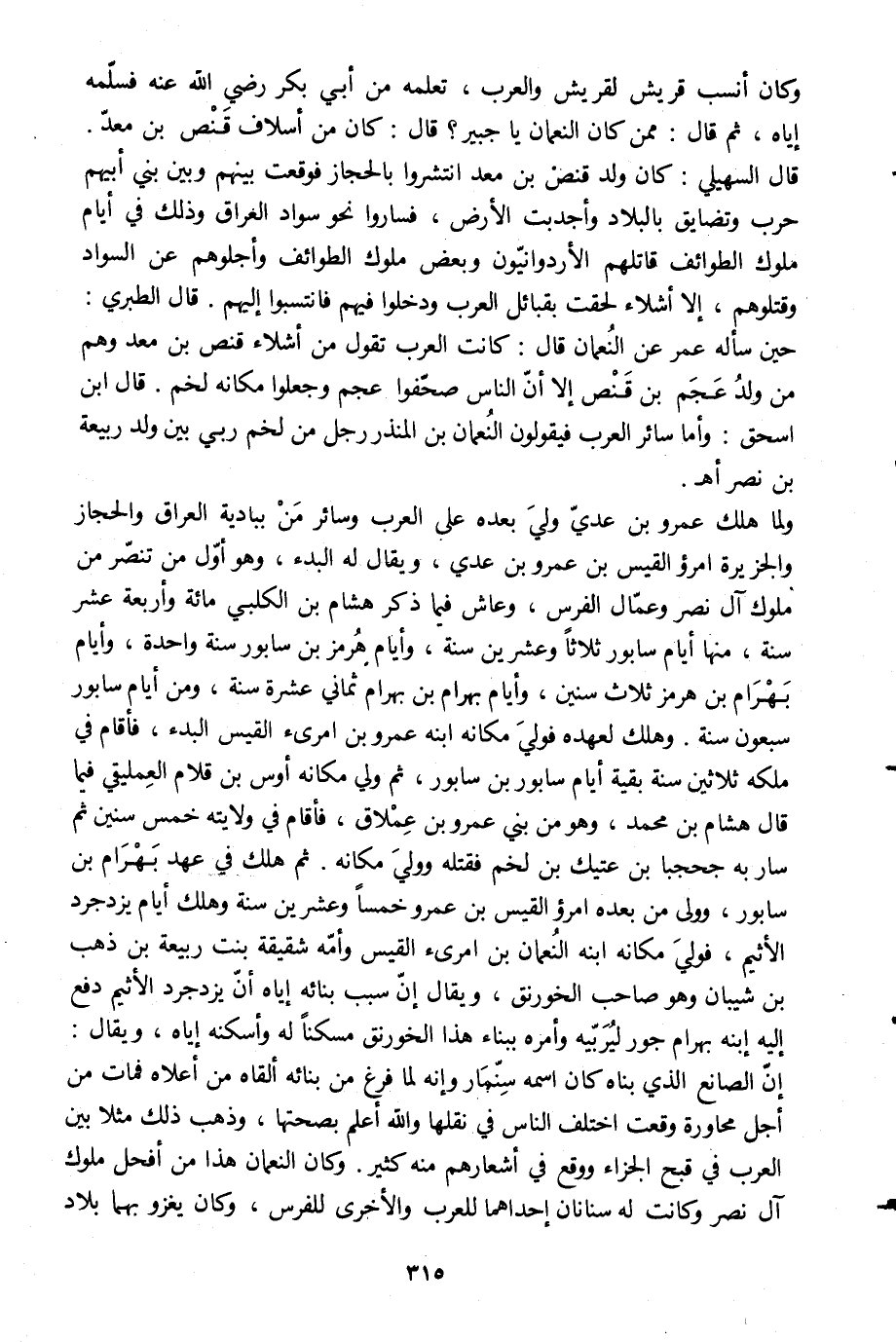 حين سأله عمر عن النعمان قال: كانت العرب تقول من أشلاء قنص بن معدوهم من ولد عجم بن قنص إلا أنّ الناس صحّفوا عجم وجعلوا مكانه لخم. قال ابن إسحاق: وأما سائر العرب فيقولون النعمان بن المنذر رجل من لخم ربي بين ولد ربيعة بن نصر أهـ.