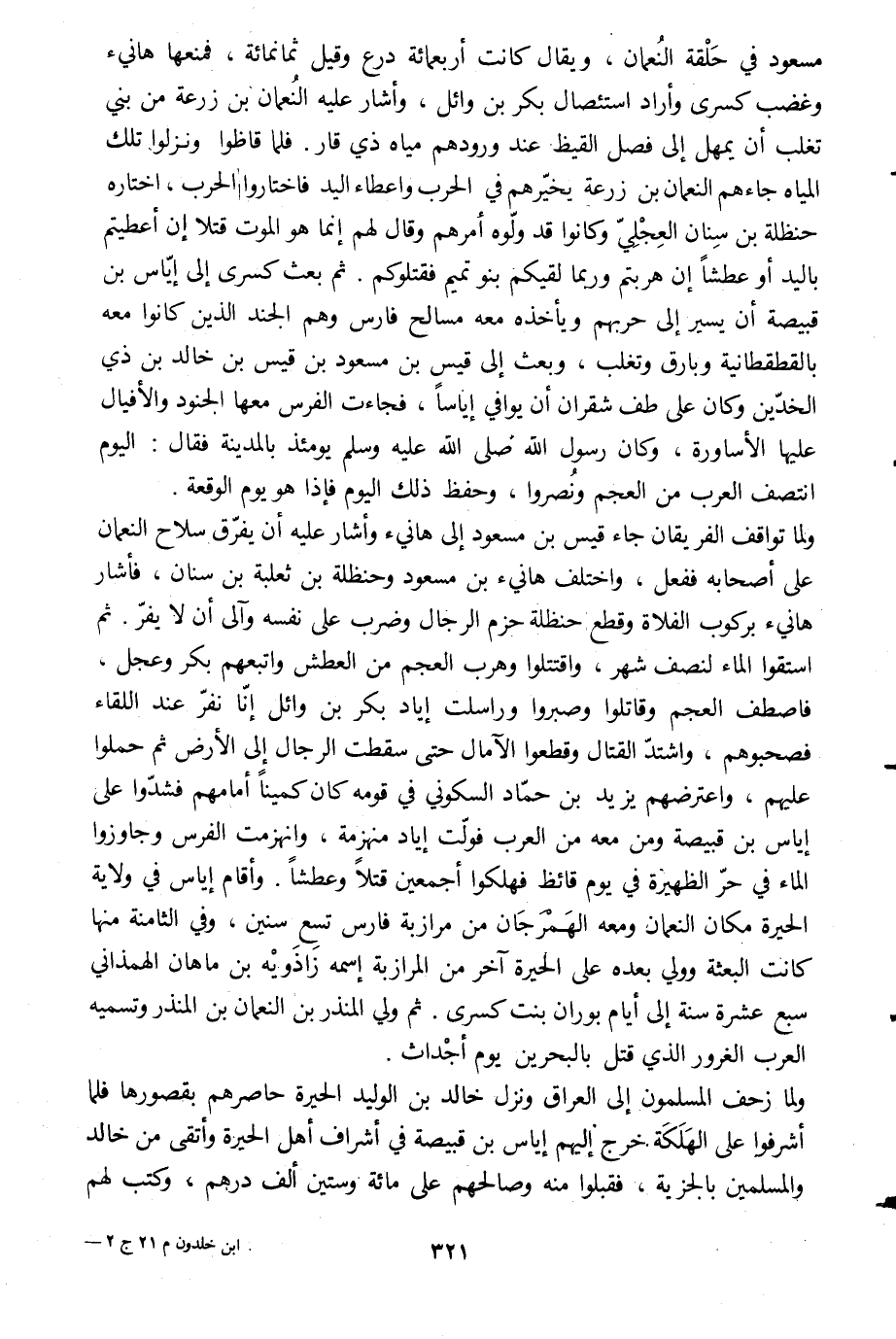 ولما تواقف الفريقان جاء قيس بن مسعود إلى هانئ وأشار عليه أن يفرّق سلاح النعمان على أصحابه ففعل، واختلف هانئ بن مسعود وحنظلة بن ثعلبة بن سنان، فأشار هانئ بركوب الفلاة وقطع حنظلة حزم الرجال وضرب على نفسه وآلى أن لا يفرّ. ثم استقوا الماء لنصف شهر، واقتتلوا وهرب العجم من العطش واتبعهم بكر وعجل، فاصطف العجم وقاتلوا وصبروا وراسلت إياد بكر بن وائل إنّا نفّر عند اللقاء فصحبوهم، واشتدّ القتال وقطعوا الآمال حتى سقطت الرجال إلى الأرض ثم حملوا عليهم، واعترضهم يزيد بن حمّاد السكونيّ في قومه كان كمينا أمامهم فشدّوا على إياس بن قبيصة ومن معه من العرب فولّت إياد منهزمة، وانهزمت الفرس وجاوزوا الماء في حرّ الظهيرة في يوم قائظ فهلكوا أجمعين قتلا وعطشا. وأقام إياس في ولاية الحيرة مكان النعمان ومعه الهمرجان من مرازبة فارس تسع سنين، وفي الثامنة منها كانت البعثة وولي بعده على الحيرة آخر من المرازبة اسمه زاذويه بن ماهان الهمذاني سبع عشرة سنة إلى أيام بوران بنت كسرى. ثم ولي المنذر بن النعمان بن المنذر وتسميه العرب والغرور الّذي قتل بالبحرين يوم أجداث.