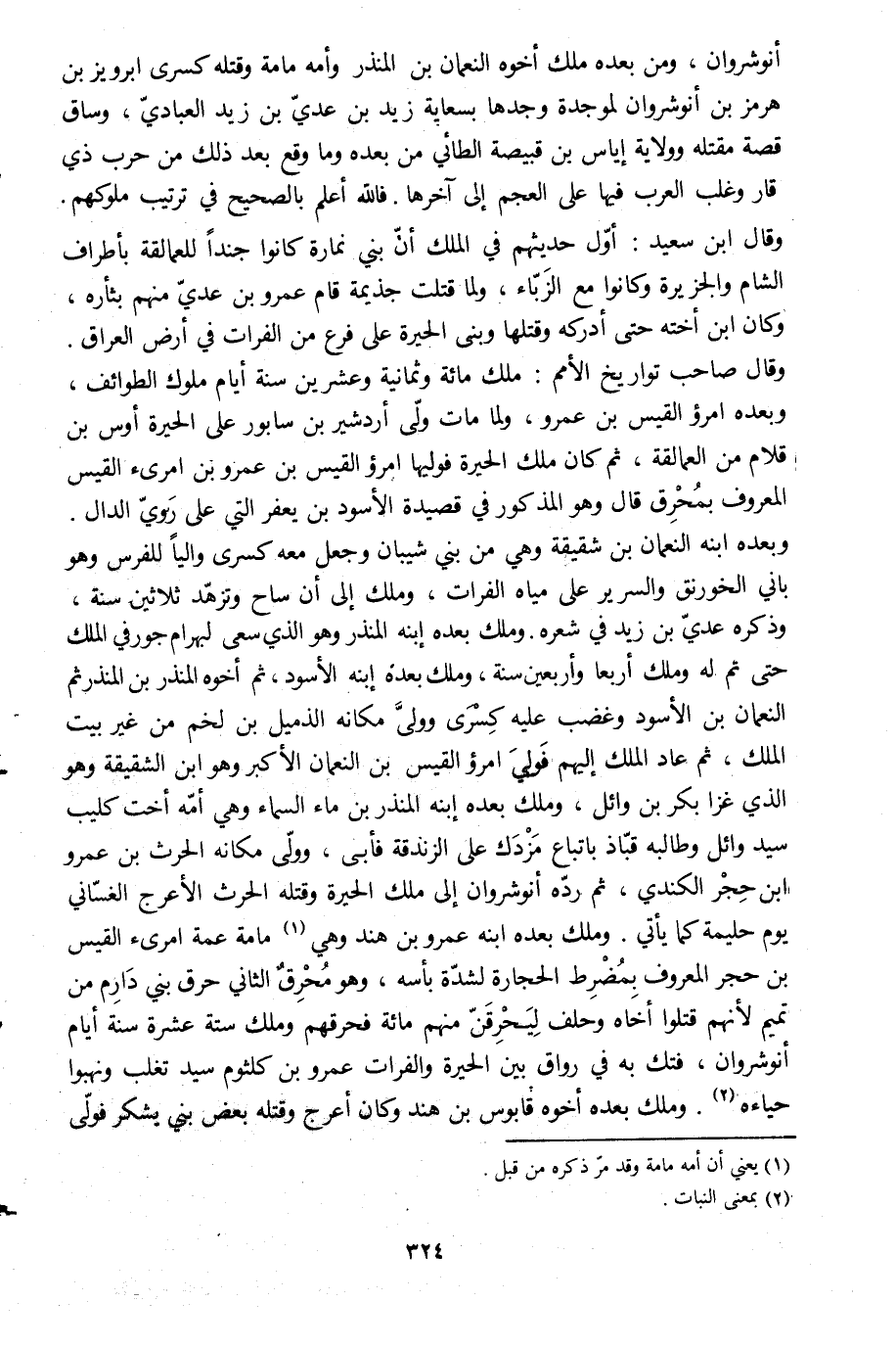 أنوشروان، ومن بعده ملك أخوه النعمان بن المنذر وأمه مامة وقتله كسرى أبرويز بن هرمز بن أنوشروان لموجدة وجدها بسعاية زيد بن عديّ بن زيد العباديّ، وساق قصة مقتله وولاية إياس بن قبيصة الطائي من بعده وما وقع بعد ذلك من حرب ذي قار وغلب العرب فيها على العجم إلى آخرها. فاللَّه أعلم بالصحيح في ترتيب ملوكهم.