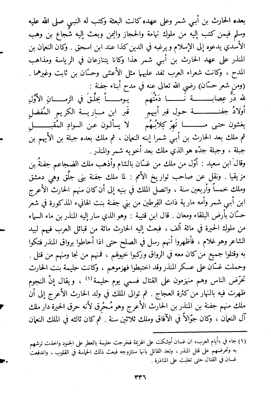 وحملت غسّان على عسكر المنذر وقد اختطوا فهزموهم، وكانت حليمة بنت الحارث تحرّض الناس وهم منهزمون على القتال فسمي يوم حليمة [1] ، ويقال إنّ النجوم ظهرت فيه بالنهار من كثرة العجاج. ثم توالى الملك في ولد الحارث الأعرج إلى أن ملك منهم جفنة بن المنذر بن الحارث الأعرج وهو محرق لأنه حرق الحيرة دار ملك آل النعمان، وكان جوّالا في الآفاق وملك ثلاثين سنة. ثم كان ثالثة في الملك النعمان
