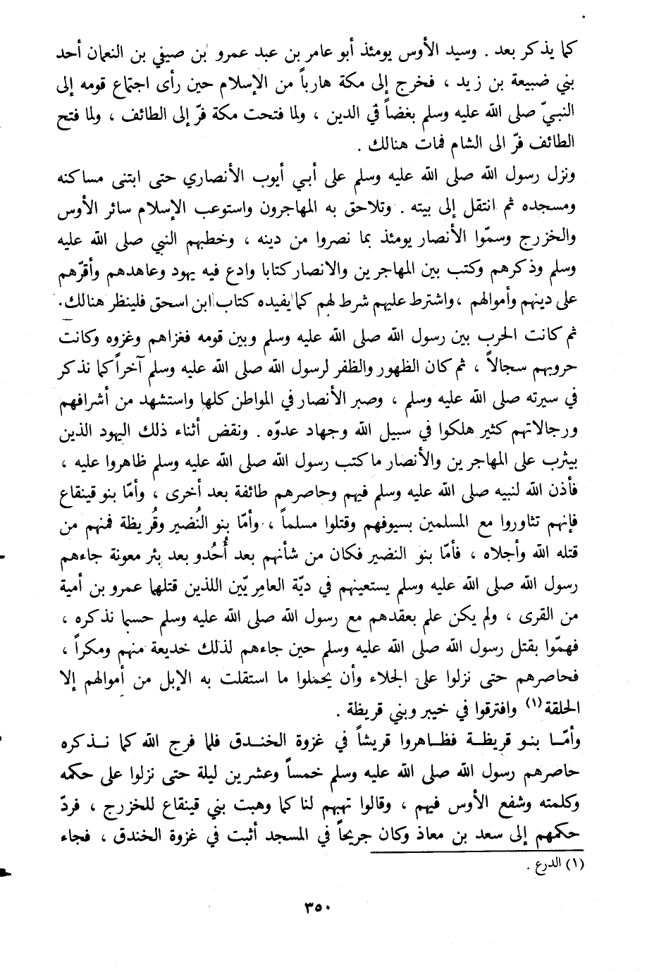 ثم كانت الحرب بين رسول الله صلى الله عليه وسلم وبين قومه فغزاهم وغزوة وكانت حروبهم سجالا، ثم كان الظهور والظفر لرسول الله صلى الله عليه وسلم آخرا كما نذكر في سيرته صلى الله عليه وسلم، وصبر الأنصار في المواطن كلها واستشهد من أشرافهم ورجالاتهم كثير هلكوا في سبيل الله وجهاد عدوّه. ونقض أثناء ذلك اليهود الذين بيثرب على المهاجرين والأنصار ما كتب رسول الله صلى الله عليه وسلم ظاهروا عليه، فأذن الله لنبيه صلى الله عليه وسلم فيهم وحاصرهم طائفة بعد أخرى، وأمّا بنو قينقاع فإنّهم تثاوروا مع المسلمين بسيوفهم وقتلوا مسلما، وأمّا بنو النضير وقريظة فمنهم من قتله الله وأجلاه، فأمّا بنو النضير فكان من شأنهم بعد أحد وبعد بئر معونة جاءهم رسول الله صلى الله عليه وسلم يستعينهم في دية العامريّين اللذين قتلهما عمرو بن أمية من القرى، ولم يكن علم بعقدهم مع رسول الله صلى الله عليه وسلم حسبما نذكره، فهمّوا بقتل رسول الله صلى الله عليه وسلم حين جاءهم لذلك خديعة منهم ومكرا، فحاصرهم حتى نزلوا على الجلاء وأن يحملوا ما استقلت به الإبل من أموالهم إلا الحلقة [1] وافترقوا في خيبر وبني قريظة.
