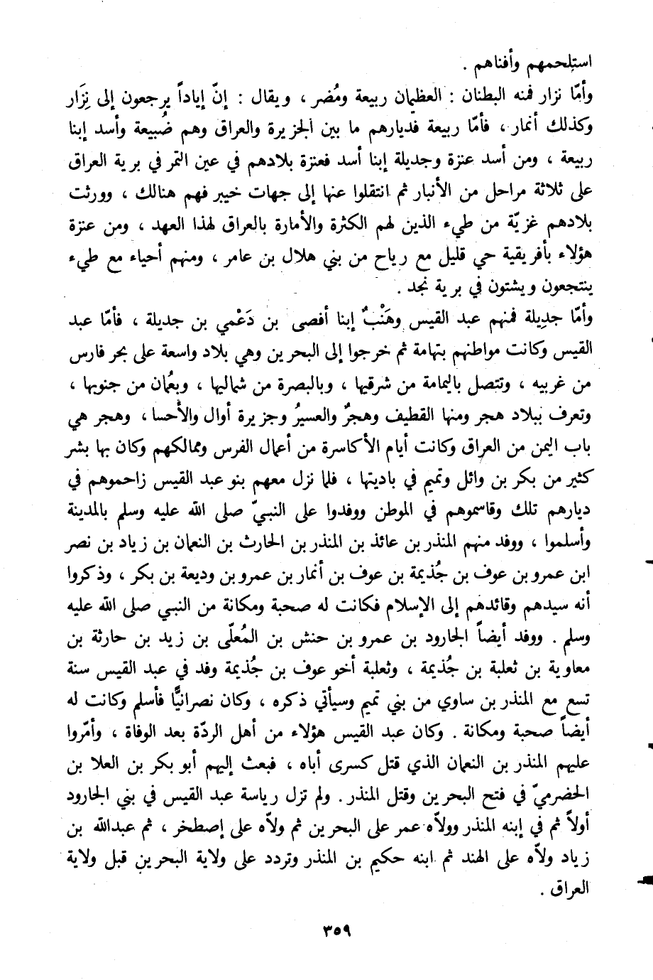 وأمّا جديلة فمنهم عبد القيس وهنب ابنا أفصى بن دعمي بن جدلة، فأمّا عبد القيس وكانت مواطنهم بتهامة ثم خرجوا إلى البحرين وهي بلاد واسعة على بحر فارس من غريبه، وتتصل باليمامة من شرقيها، وبالبصرة من شماليها، وبعمان من جنوبها، وتعرف ببلاد هجر ومنها القطيف وهجر والعسير وجزيرة أوال والأحساء، وهجر هي باب اليمن من العراق وكانت أيام الأكاسرة من أعمال الفرس وممالكهم وكان بها بشر كثير من بكر بن وائل وتميم في باديتها، فلما نزل معهم بنو عبد القيس زاحموهم في ديارهم تلك وقاسموهم في الموطن ووفدوا على النبيّ صلى الله عليه وسلم بالمدينة وأسلموا، ووفد منهم المنذر بن عائذ بن المنذر بن الحارث بن النعمان بن زياد بن نصر ابن عمرو بن عوف بن جذيمة بن عوف بن أنمار بن عمرو بن وديعة بن بكر، وذكروا أنه سيدهم وقائدهم إلى الإسلام فكانت له صحبة ومكانة من النبي صلى الله عليه وسلم. ووفد أيضا الجارود بن عمرو بن حنش بن المعلّى بن زيد بن حارثة بن معاوية بن ثعلبة بن جذيمة، وثعلبة أخو عوف بن جذيمة وفد في عبد القيس سنة تسع مع المنذر بن ساوي من بني تميم وسيأتي ذكره، وكان نصرانيّا فأسلم وكانت له أيضا صحبة ومكانة. وكان عبد القيس هؤلاء من أهل الردّة بعد الوفاة، وأمّروا عليهم المنذر بن النعمان الّذي قتل كسرى أباه، فبعث إليهم أبو بكر بن العلا بن الحضرميّ في فتح البحرين وقتل المنذر. ولم تزل رياسة عبد القيس في بني الجارود أولا ثم في ابنه المنذر وولّاه عمر على البحرين ثم ولّاه على إصطخر، ثم عبد الله بن زياد ولّاه على الهند ثم ابنه حكيم بن المنذر وتردد على ولاية البحرين قبل ولاية العراق.