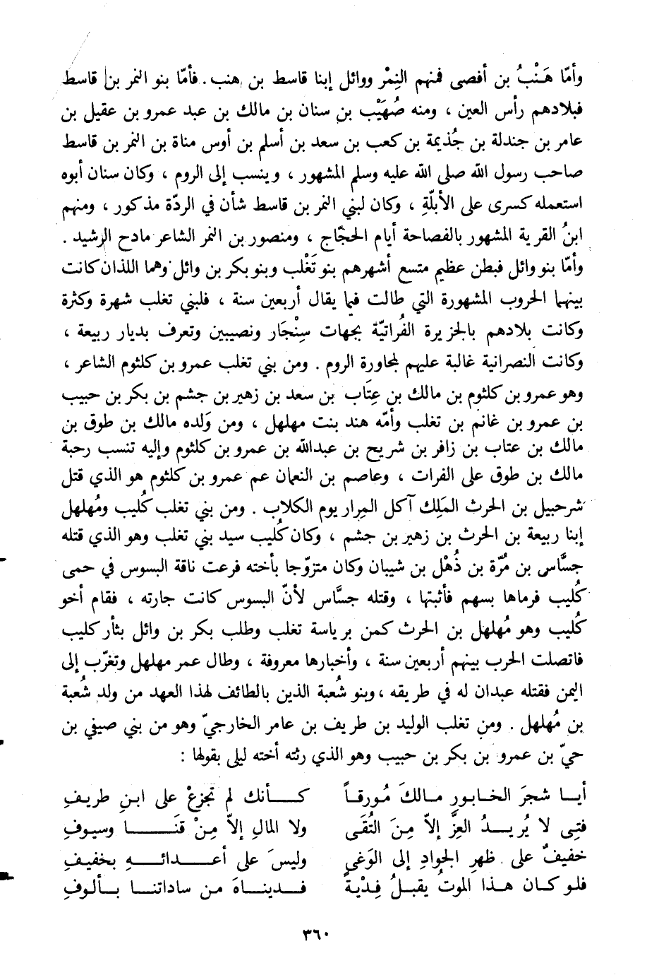 وأمّا بنو وائل فبطن عظيم متسع أشهرهم بنو تغلب وبنو بكر بن وائل وهما اللذان كانت بينهما الحروب المشهورة التي طالت فيما يقال أربعين سنة، فلبني تغلب شهرة وكثرة وكانت بلادهم بالجزيرة الفراتيّة بجهات سنجار ونصيبين وتعرف بديار ربيعة، وكانت النصرانية غالبة عليهم لمجاورة الروم. ومن بني تغلب عمرو بن كلثوم الشاعر، وهو عمرو بن كلثوم بن مالك بن عتاب بن سعد بن زهير بن جشم بن بكر بن حبيب بن عمرو بن غانم بن تغلب وأمّه هند بنت مهلهل، ومن ولده مالك بن طوق بن مالك بن عتاب بن زافر بن شريح بن عبد الله بن عمرو بن كلثوم وإليه تنسب رحبة مالك بن طوق على الفرات، وعاصم بن النعمان عم عمرو بن كلثوم هو الّذي قتل شرحبيل بن الحرث الملك آكل المرار يوم الكلاب. ومن بني تغلب كليب ومهلهل ابنا ربيعة بن الحرث بن زهير بن جشم، وكان كليب سيد بني تغلب وهو الّذي قتله جسّاس بن مرّة بن ذهل بن شيبان وكان متزوّجا بأخته فرعت ناقة البسوس في حمى كليب فرماها بسهم فأثبتها، وقتله جسّاس لأنّ البسوس كانت جارته، فقام أخو كليب وهو مهلهل بن الحرث كمن برياسة تغلب وطالب بكر بن وائل بثأر كليب فاتصلت الحرب بينهم أربعين سنة، وأخبارها معروفة، وطال عمر مهلهل وتغرّب إلى اليمن فقتله عبدان له في طريقه، وبنو شعبة الذين بالطائف لهذا العهد من ولد شعبة بن مهلهل. ومن تغلب الوليد بن طريف بن عامر الخارجيّ وهو من بني صيفي بن حيّ بن عمرو بن بكر بن حبيب وهو الّذي رثته أخته ليلى بقولها: