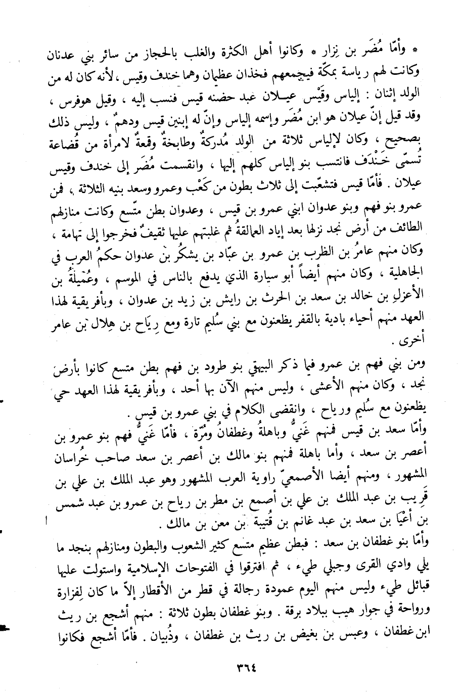 وأمّا سعد بن قيس فمنهم غنيّ وباهلة وغطفان ومرّة، فأمّا غنيّ فهم بنو عمرو بن أعصر بن سعد، وأما باهلة فمنهم بنو مالك بن أعصر بن سعد صاحب خراسان المشهور، ومنهم أيضا الأصمعيّ رواية العرب المشهور وهو عبد الملك بن علي بن قريب بن عبد الملك بن علي بن أصمع بن مطر بن رياح بن عمرو بن عبد شمس بن أعيا بن سعيد بن عبد غانم بن قتيبة بن معن بن مالك.
