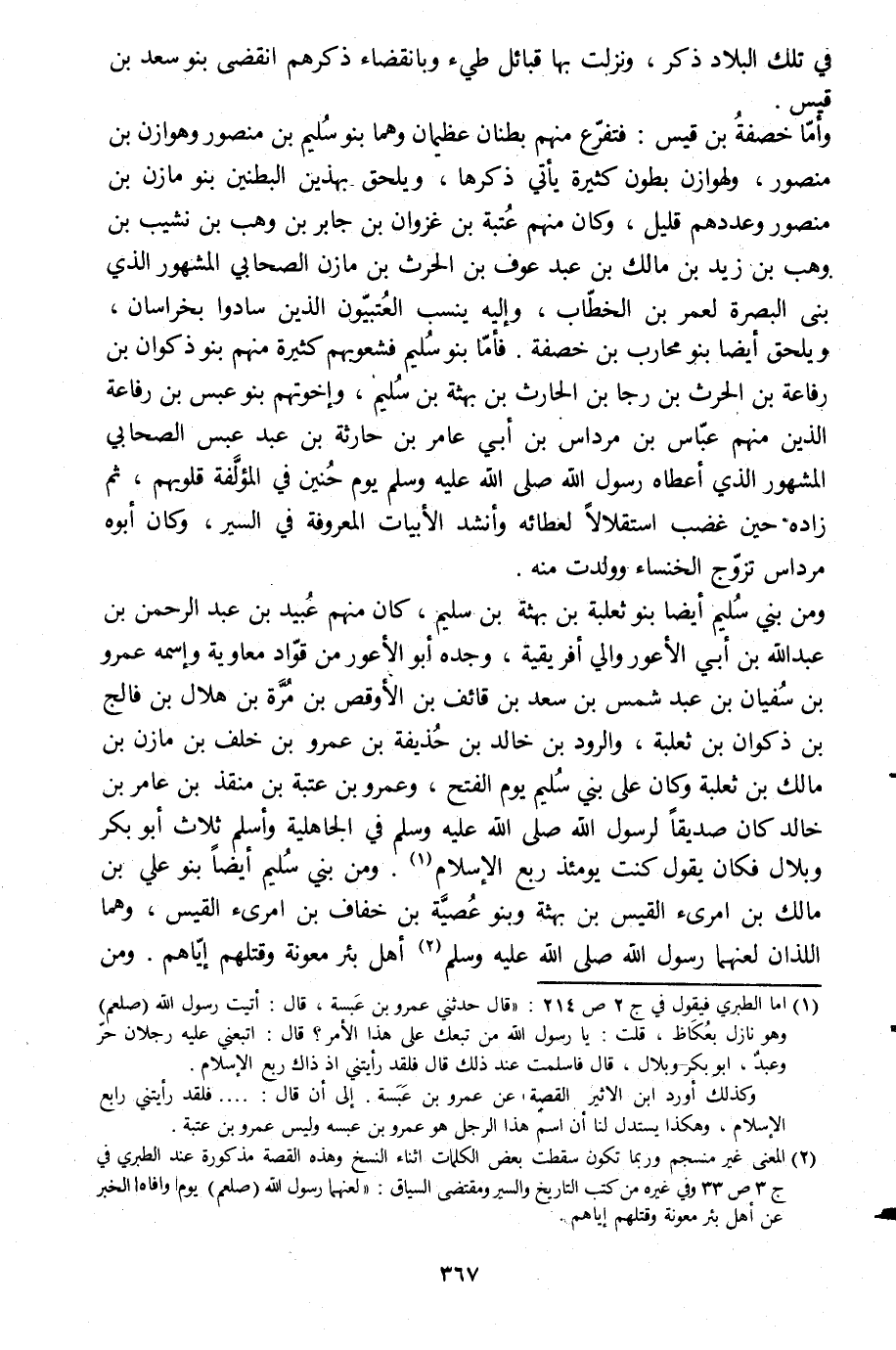 وأمّا خصفة بن قيس: فتفرّع منهم بطنان عظيمان وهما بنو سليم بن منصور وهوازن بن منصور، ولهوازن بطون كثيرة يأتي ذكرها، ويلحق بهذين البطنين بنو مازن بن منصور وعددهم قليل، وكان منهم عتبة بن غزوان بن جابر بن وهب بن نشيب بن وهب بن زيد بن مالك بن عبد عوف بن الحرث بن مازن الصحابي المشهور الّذي بني البصرة لعمر بن الخطّاب، وإليه ينسب العتبيّون الذين سادوا بخراسان، ويلحق أيضا بنو محارب بن خصفة. فأمّا بنو سليم فشعوبهم كثيرة منهم بنو ذكوان بن رفاعة بن الحرث بن رجا بن الحارث بن بهثة بن سليم، وإخوتهم بنو عبس بن رفاعة الذين منهم عبّاس بن مرداس بن أبي عامر بن حارثة بن عبد عبس الصحابي المشهور الّذي أعطاه رسول الله صلى الله عليه وسلم يوم حنين في المؤلّفة قلوبهم، ثم زاده حين غضب استقلالا لعطائه وأنشد الأبيات المعروفة في السير، وكان أبوه مرداس تزوّج الخنساء وولدت منه.