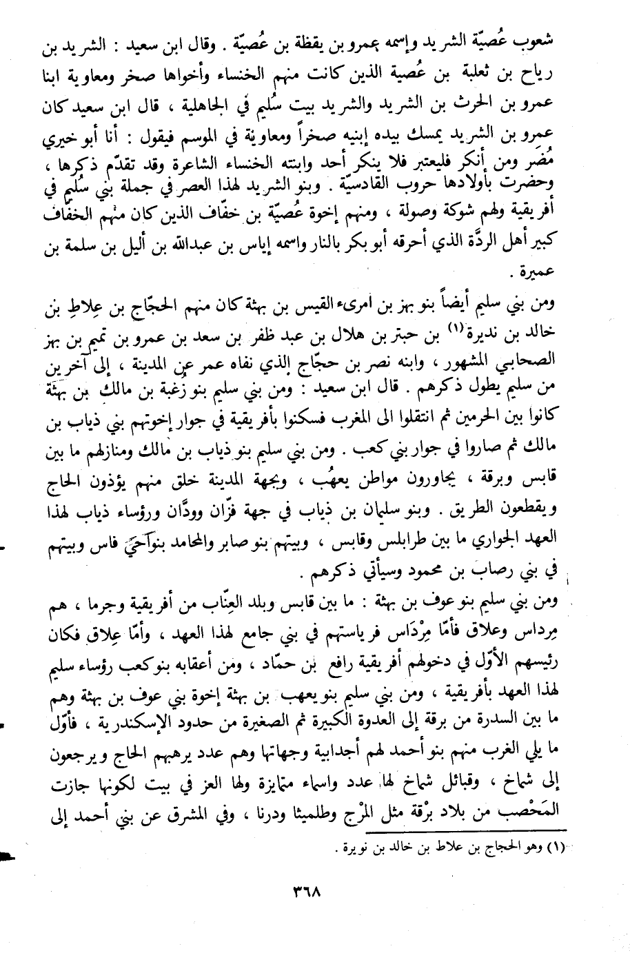 ومن بني سلم أيضا بنو بهز بن امرئ القيس بن بهثة كان منهم الحجّاج بن علا بن خالد بن نديرة [1] بن حبتر بن هلال بن عبد ظفر بن سعد بن عمرو بن تميم بن بهز الصحابي المشهور، وابنه نصر بن حجّاج الّذي نفاه عمر عن المدينة، إلى آخرين من سليم يطون ذكرهم. قال ابن سعيد: ومن بني سليم بنو زغبة بن مالك بن بهثة كانوا بين الحرمين ثم انتقلوا الى المغرب فسكنوا بإفريقية في جوار إخوتهم بني ذياب بن مالك ثم صاروا في جوار بني كعب. ومن بني سليم بنو ذياب بن مالك ومنازلهم ما بين قابس وبرقة، يجاورون مواطن يعهب، وبجهة المدينة خلق منهم يؤذون الحاج ويقطعون الطريق. وبنو سليمان بن ذياب في جهة فزّان وودّان ورؤساء ذياب لهذا العهد الجواري ما بين طرابلس وقابس، وبيتهم بنو صابر والمحامد بنواحي فاس وبيتهم في بني رحاب بن محمود وسيأتي ذكرهم.