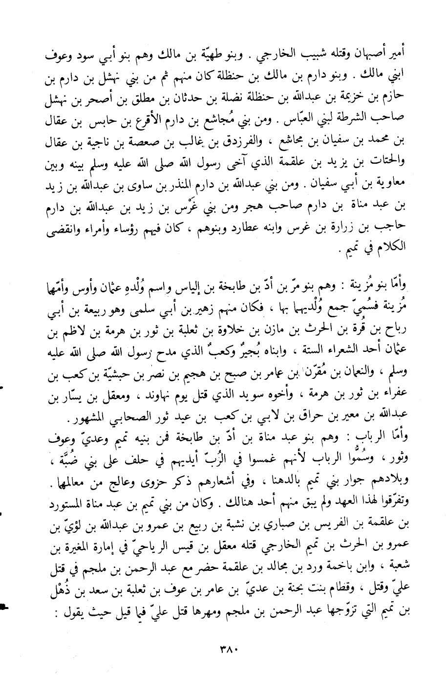 أمير أصبهان وقتله شبيب الخارجي. وبنو طهيّة بن مالك وهم بنو أبي سود وعوف ابني مالك. وبنو دارم بن مالك بن حنظلة كان منهم ثم من بني نهشل بن دارم بن حازم بن خزيمة بن عبد الله بن حنظلة نضلة بن حدثان بن مطلق بن أصحر بن نهشل صاحب الشرطة لبني العبّاس. ومن بني مجاشع بن دارم الأقرع بن حابس بن عقال بن محمد بن سفيان بن مجاشع، والفرزدق بن غالب بن صعصعة بن ناجية بن عقال والحتات بن يزيد بن علقمة الّذي آخى رسول الله صلى الله عليه وسلم بينه وبين معاوية بن أبي سفيان. ومن بني عبد الله بن دارم المنذر بن ساوى بن عبد الله بن زيد بن عبد مناة بن دارم صاحب هجر ومن بني غرس بن زيد بن عبد الله بن دارم حاجب بن زرارة بن غرس وابنه عطارد وبنوهم، كان فيهم رؤساء وأمراء وانقضى الكلام في تميم.