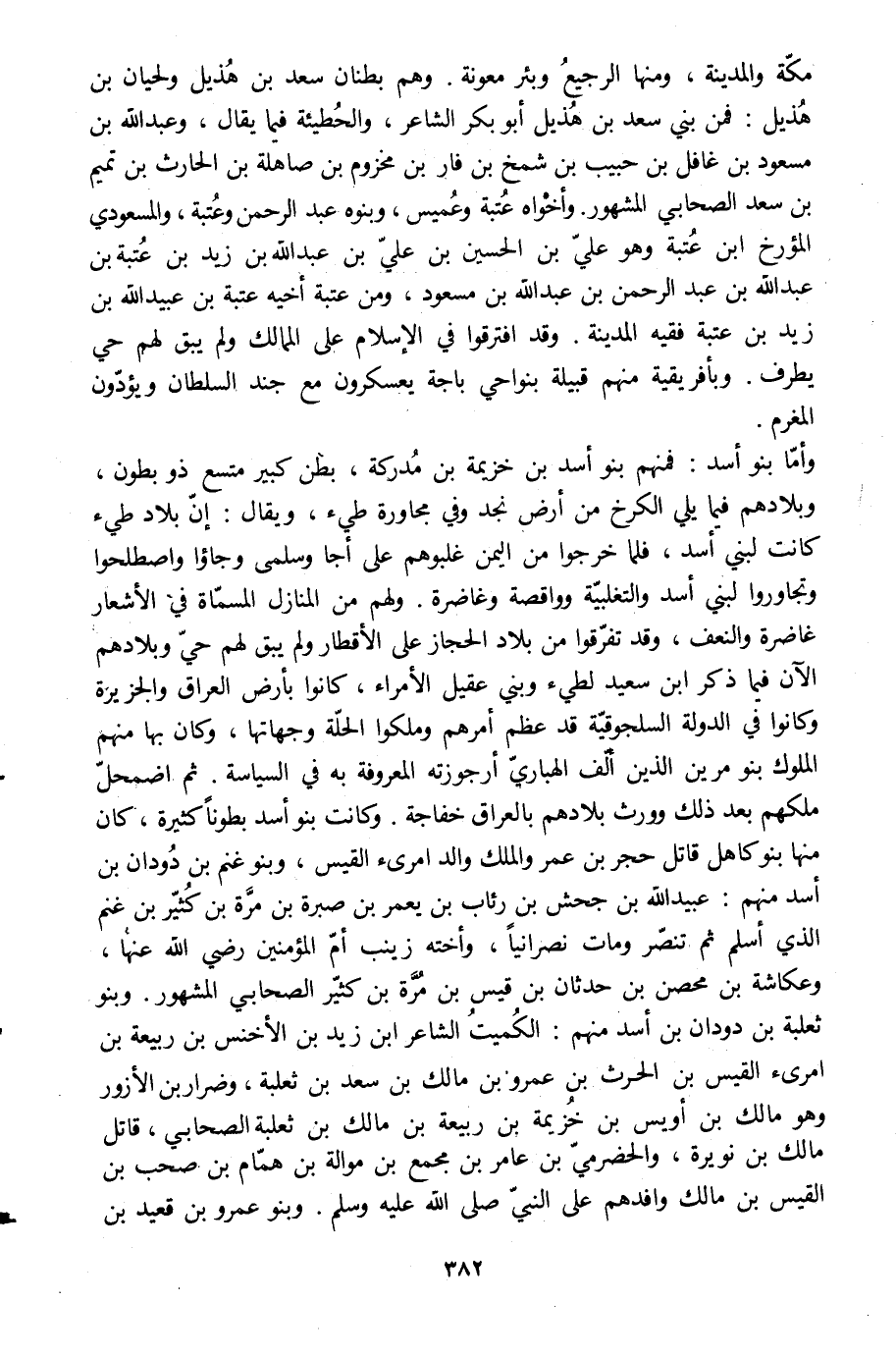 وأمّا بنو أسد: فمنهم بنو أسد بن خزيمة بن مدركة، بطن كبير متسع ذو بطون، وبلادهم فيما يلي الكرخ من أرض نجد وفي مجاورة طيِّئ، ويقال: إنّ بلاد طيِّئ كانت لبني أسد، فلما خرجوا من اليمن غلبوهم على أجا وسلمى وجاءوا واصطلحوا وتجاوروا لبني أسد والتغلبيّة وواقصة وغاضرة. ولهم من المنازل المسمّاة في الأشعار غاضرة والنعف، وقد تفرّقوا من بلاد الحجاز على الأقطار ولم يبق لهم حيّ وبلادهم الآن فيما ذكر ابن سعيد لطيّئ وبني عقيل الأمراء، كانوا بأرض العراق والجزيرة وكانوا في الدولة السلجوقيّة قد عظم أمرهم وملكوا الحلّة وجهاتها، وكان بها منهم الملوك بنو مرين الذين ألّف الهباريّ أرجوزته المعروفة به في السياسة. ثم اضمحلّ ملكهم بعد ذلك وورث بلادهم بالعراق خفاجة. وكانت بنو أسد بطونا كثيرة، كان منها بنو كاهل قاتل حجر بن عمرو الملك والد امرئ القيس، وبنو غنم بن دودان بن أسد منهم: عبيد الله بن جحش بن رئاب بن يعمر بن صبرة بن مرّة بن كثّير بن غنم الّذي أسلم ثم تنصّر ومات نصرانيا، وأخته زينب أمّ المؤمنين رضي الله عنها، وعكاشة بن محصن بن حدثان بن قيس بن مرّة بن كثّير الصحابي المشهور. وبنو ثعلبة بن دودان بن أسد منهم: الكميت الشاعر ابن زيد بن الأخنس بن ربيعة بن امرئ القيس بن الحرث بن عمرو بن مالك بن سعد بن ثعلبة، وضرار بن الأزور وهو مالك بن أويس بن خزيمة بن ربيعة بن مالك بن ثعلبة الصحابي، قاتل مالك بن نويرة، والحضرميّ بن عامر بن مجمع بن موالة بن همّام بن صحب بن القيس بن مالك وافدهم على النبيّ صلى الله عليه وسلم. وبنو عمرو بن قعيد بن
