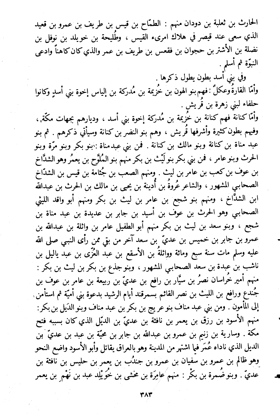 وأمّا كنانة فهم كنانة بن خزيمة بن مدركة إخوة بني أسد، وديارهم بجهات مكّة، وفيهم بطون كثيرة وأشرفها قريش، وهم بنو النضر بن كنانة وسيأتي ذكرهم. ثم بنو عبد مناة بن كنانة وبنو مالك بن كنانة. فمن بني عبد مناة: بنو بكر وبنو مرّة وبنو الحرث وبنو عامر، فمن بني بكر بنو ليث بن بكر منهم بنو الملوّح بن يعمر وهو الشدّاخ بن عوف بن كعب بن عامر بن ليث. ومنهم الصعب بن جثامة بن قيس بن الشدّاخ الصحابي المشهور، والشاعر عروة بن أدينة بن يحيى بن مالك بن الحرث بن عبد الله ابن الشدّاخ، ومنهم بنو شجع بن عامر بن ليث بن بكر ومنهم أبو واقد الليثي الصحابي وهو الحرث بن عوف بن أسيد بن جابر بن عديدة بن عبد مناة بن شجع، وبنو سعد بن ليث بن بكر منهم أبو الطفيل عامر بن واثلة بن عبد الله بن عمرو بن جابر بن خميس بن عديّ بن سعد آخر من بقي ممن رأى النبي صلى الله عليه وسلم مات سنة سبع ومائة وواثلة بن الأسقع بن عبد العزّى بن عبد ياليل بن ناشب بن عبدة بن سعد الصحابي المشهور، وبنو جذع بن بكر بن ليث بن بكر: