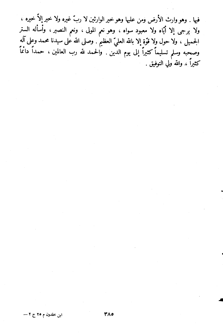 فيها. وهو وارث الأرض ومن عليها وهو خير الوارثين لا ربّ غيره ولا خير إلّا خيره، ولا يرجى إلا إيّاه ولا معبود سواه، وهم نعم المولى، ونعم النصير، وأسأله الستر الجميل، ولا حول ولا قوّة إلّا باللَّه العليّ العظيم. وصلى الله على سيدنا محمد وعلى آله وصحبه وسلم تسليما كثيرا إلى يوم الدين. والحمد للَّه رب العالمين، حمدا دائما كثيرا، والله ولي التوفيق.