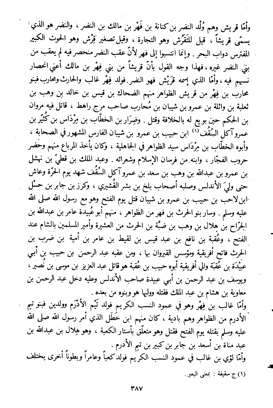 وأمّا قريش وهم ولد النضر بن كنانة بن فهر بن مالك بن النضر، والنضر هو الّذي يسمّى قريشا، قيل للتفرش وهو التجارة، وقيل تصغير قرش وهو الحوت الكبير المفترس دواب البحر. وإنما انتسبوا إلى فهر لأنّ عقب النضر منحصر فيه لم يعقب من بني النضر غيره، فهذا وجه القول بأن قريشا من بني فهر بن مالك أعني انحصار نسبهم فيه، وأمّا الّذي اسمه قريش فهو النضر. فولد فهر غالب والحارث ومحارب فبنو محارب بن فهر من قريش الظواهر منهم الضحاك بن قيس بن خالد بن وهب بن ثعلبة بن واثلة بن عمرو بن شيبان بن محارب صاحب مرج راهط، قاتل فيه مروان بن الحكم حين بويع له بالخلافة وقتل. وضرار بن الخطّاب بن مرداس بن كثّير بن عمرو آكل السقف [1] ابن حبيب بن عمرو بن شيبان الفارس المشهور في الصحابة، وأبوه الخطّاب بن مرداس سيد الظواهر في الجاهلية، وكان يأخذ المرباع منهم وحضر حروب الفجّار، وابنه من فرسان الإسلام وشعرائه. وعبد الملك بن قطيّ بن نهشل بن عمرو بن عبد الله بن وهب بن سعد بن عمرو آكل السقف شهد يوم الحرّة وعاش حتى ولي الأندلس وصلبه أصحاب بلخ بن بشر القشيري، وكرز بن جابر بن حسل ابن لاحب بن حبيب بن عمرو بن شيبان قتل يوم الفتح وهو مع رسول الله صلى الله عليه وسلم. وسار بنو الحرث بن فهر من الظواهر، منهم أبو عبيدة عامر بن عبد الله بن الجرّاح بن هلال بن وهب بن ضبّة بن الحرث من العشيرة وأمير المسلمين بالشام عند الفتح، وعقبة بن نافع بن عبد قيس بن لقيط بن عامر بن أمية بن ضرب بن الحرث فاتح إفريقية ومؤسس القيروان بها، ومن عقبه عبد الرحمن بن حبيب بن أبي عبيدة بن عقبة والي إفريقية أبوه حبيب بن عقبة هو قاتل عبد العزيز بن موسى بن نصير، ويوسف بن عبد الرحمن بن أبي عبيدة صاحب الأندلس وعليه دخل عبد الرحمن بن معاوية بن هشام بن عبد الملك فقتله ووليها هو وبنوه من بعده.