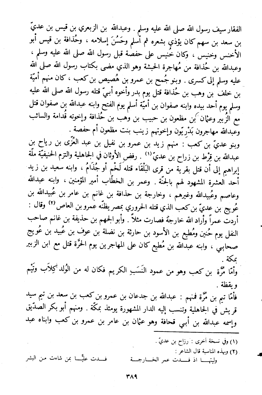 الفقار سيف رسول الله صلى الله عليه وسلم. وعبد الله بن الزبعري بن قيس بن عديّ بن سعد بن سهم كان يؤذي بشعره ثم أسلم وحسن إسلامه، وحذافة بن قيس أبو الأخنس وخنيس، وكان خنيس على حفصة قبل رسول الله صلى الله عليه وسلم، وعبد الله بن حذافة من مهاجرة الحبشة وهو الّذي مضى بكتاب رسول الله صلى الله عليه وسلم إلى كسرى. وبنو جمح بن عمرو بن هصيص بن كعب، كان منهم أميّة بن خلف بن وهب بن حذافة قتل يوم بدر وأخوه أبيّ قتله رسول الله صلى الله عليه وسلم يوم أحد بيده وابنه صفوان بن أميّة أسلم يوم الفتح وابنه عبد الله بن صفوان قتل مع الزبير وعثمان بن مظعون بن حبيب بن وهب بن حذافة وإخوته قدامة والسائب وعبد الله مهاجرون بدريّون وإخوتهم زينب بنت مظعون أم حفصة.