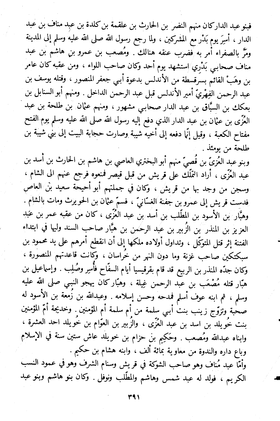 وهبّار بن الأسود بن المطّلب بن أسد بن عبد العزّى، كان من عقبه عمر بن عبد العزيز بن المنذر بن الزبير بن عبد الرحمن بن هبّار صاحب السند وليها في ابتداء الفتنة إثر قتل المتوكّل، وتداول أولاده ملكها إلى أن انقطع أمرهم على يد محمود بن سبكتكين صاحب غزنة وما دون النهر من خراسان، وكانت قاعدتهم المنصورة، وكان جدّه المنذر بن الربيع قد قام بقرقيسياء أيام السفّاح فأسر وصلب. وإسماعيل بن هبّار قتله مصعب بن عبد الرحمن غفيلة، وهبّار كان يهجو النبي صلى الله عليه وسلم، ثم ابنه عوف أسلم فمدحه وحسن إسلامه. وعبد الله بن زمعة بن الأسود له صحبة وتزوّج زينب بنت أبي سلمة من أم سلمة أم المؤمنين. وخديجة أمّ المؤمنين بنت خويلد بن أسد بن عبد العزّى، والزبير بن العوّام بن خويلد أحد العشرة، وابناه عبد الله ومصعب. وحكيم بن حزام بن خويلد عاش ستين سنة في الإسلام وباع داره والندوة من معاوية بمائة ألف، وابنه هشام بن حكيم.