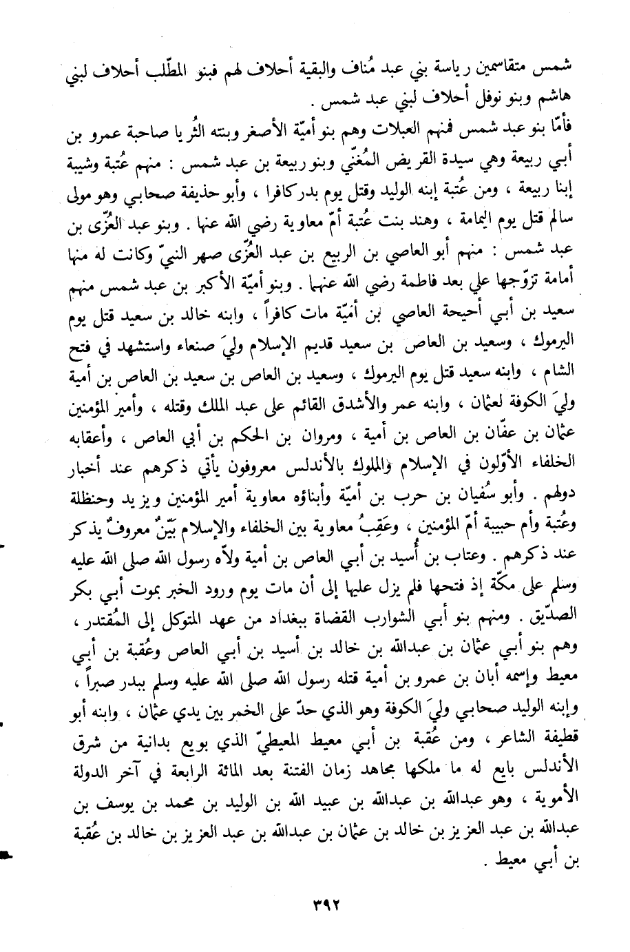 فأمّا بنو عبد شمس فمنهم العبلات وهم بنو أميّة الأصغر وبنته الثريا صاحبة عمرو بن أبي ربيعة وهي سيدة القريض المغنّي وبنو ربيعة بن عبد شمس: منهم عتبة وشيبة ابنا ربيعة، ومن عتبة ابنه الوليد وقتل يوم بدر كافرا، وأبو حذيفة صحابي وهو مولى سالم قتل يوم اليمامة، وهند بنت عتبة أمّ معاوية رضي الله عنها. وبنو عبد العزّى بن عبد شمس: منهم أبو العاصي بن الربيع بن عبد العزّى صهر النبيّ وكانت له منها أمامة تزوّجها علي بعد فاطمة رضي الله عنهما. وبنو أميّة الأكبر بن عبد شمس منهم سعيد بن أبي أحيحة العاصي بن أميّة مات كافرا، وابنه خالد بن عبد قتل يوم اليرموك، وسعيد بن العاص بن سعيد قديم الإسلام ولي صنعاء واستشهد في فتح الشام، وابنه سعيد قتل يوم اليرموك، وسعيد بن العاص بن سعيد بن العاص بن أمية ولي الكوفة لعثمان، وابنه عمرو الأشدق القائم على عبد الملك وقتله، وأمير المؤمنين عثمان بن عفّان بن العاص بن أمية، ومروان بن الحكم بن أبي العاص، وأعقابه الخلفاء الأوّلون في الإسلام والملوك بالأندلس معروفون يأتي ذكرهم عند أخبار دولهم. وأبو سفيان بن حرب بن أميّة وأبناؤه معاوية أمير المؤمنين ويزيد وحنظلة وعتبة وأم حبيبة أمّ المؤمنين، وعقب معاوية بين الخلفاء والإسلام بيّن معروف يذكر عند ذكرهم. وعتاب بن أسيد بن أبي العاص بن أمية ولّاه رسول الله صلى الله عليه وسلم على مكّة إذ فتحها فلم يزل عليها إلى أن مات يوم ورود الخبر بموت أبي بكر الصدّيق. ومنهم بنو أبي الشوراب القضاة ببغداد من عهد المتوكل إلى المقتدر، وهم بنو أبي عثمان بن عبد الله بن خالد بن أسيد بن أبي العاص وعقبة بن أبي معيط واسمه أبان بن عمرو بن أمية قتله رسول الله صلى الله عليه وسلم ببدر صبرا، وابنه الوليد صحابي ولي الكوفة وهو الّذي حدّ على الخمر بين يدي عثمان، وابنه أبو قطيفة الشاعر، ومن عقبة بن أبي معيط المعيطي الّذي بويع بدانية من شرق الأندلس بايع له ما ملكها مجاهد زمان الفتنة بعد المائة الرابعة في آخر الدولة الأموية، وهو عبد الله بن عبيد الله بن عبيد الله بن الوليد بن محمد بن يوسف بن عبد الله بن عبد العزيز بن خالد بن عثمان بن عبد الله بن عبد العزيز بن خالد بن عقبة بن أبي معيط.