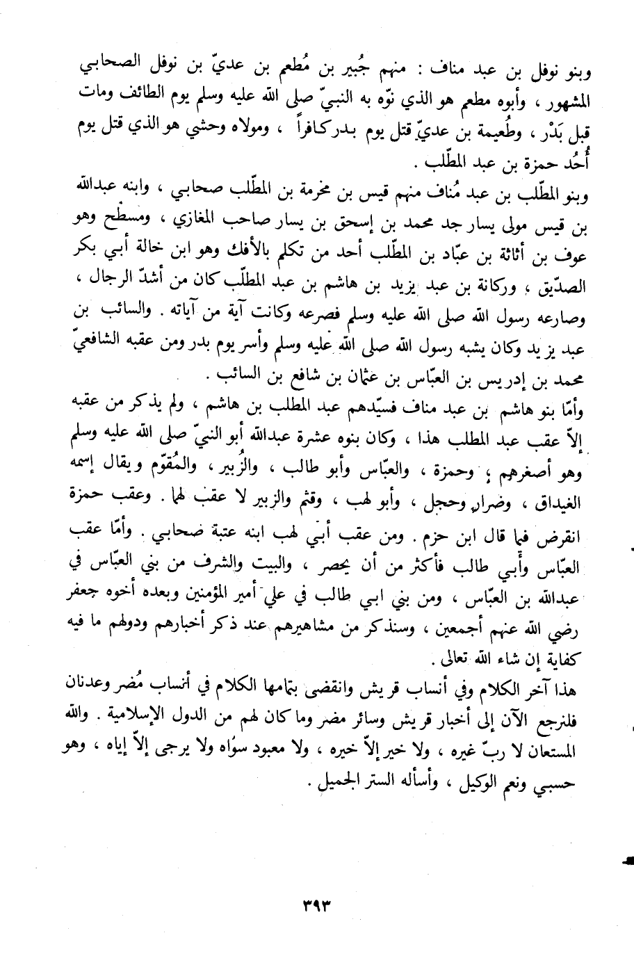 هذا آخر الكلام وفي أنساب قريش وانقضى بتمامها الكلام في أنساب مضر وعدنان فلنرجع الآن إلى أخبار قريش وسائر مضر وما كان لهم من الدول الإسلامية. والله المستعان لا ربّ غيره، ولا خير إلّا خيره، ولا معبود سواه ولا يرجى إلّا إياه، وهو حسبي ونعم الوكيل، وأسأله الستر الجميل.
