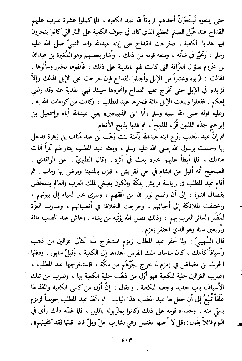 قال السهيليّ: ولما حفر عبد المطلب زمزم استخرج منه تمثالي غزالين من ذهب وأسيافا كذلك، كان ساسان ملك الفرس أهداها إلى الكعبة، وقيل سابور. ودفنها الحرث بن مضاض في زمزم لما خرج بجرهم من مكّة، فاستخرجها عبد المطلب، وضرب الغزالين حلية للكعبة فهو أوّل من ذهّب حلية الكعبة بها، وضرب من تلك الأسياف باب حديد وجعله للكعبة. ويقال: إنّ أوّل من كسى الكعبة واتخذ لها غلقا تبّع إلى أن جعل لها عبد المطلب هذا الباب. ثم اتخذ عبد المطلب حوضا لزمزم يسقي منه، وحسده قومه على ذلك وكانوا يخرّبونه بالليل، فلما غمّه ذلك رأى في النوم قائلا يقول: «قل لا أحلها لمغتسل وهي لشارب حلّ وبلّ فإذا قلتها فقد كفيتهم»