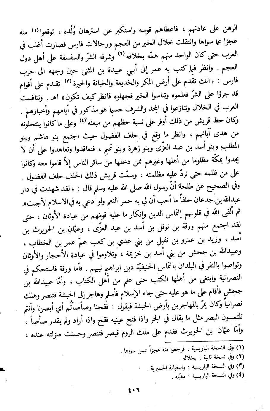 الرهن على عادتهم، فأعطاهم قوسه واستكبر عن استرهان ولده، توقعوا [1] منه عجزا عما سواها وانتقلت خلال الخير من العجم ورجالات فارس فصارت أغلب في العرب حتى كان الواحد منهم همّه بخلافه [2] وشرفه الشرّ والسفسفة على أهل دول العجم. وانظر فيما كتب به عمر إلى أبي عبيدة بن المثنى حين وجهه الى حرب فارس: «انك تقدم على أرض المكر والخديعة والخيانة والحيرة [3] تقدم على أقوام قد جرءوا على الشرّ فعلموه وتناسوا الخير فجهلوه فانظر كيف تكون» أهـ. وتنافست العرب في الخلال وتنازعوا في المجد والشرف حسبما هو مذكور في أيامهم وأخبارهم.