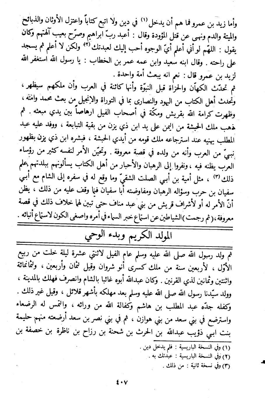 وأما زيد بن عمرو فما هم أن يدخل [1] في دين ولا اتبع كتابا واعتزل الأوثان والذبائح والميتة والدم ونهى عن قتل الموءودة وقال: أعبد ربّ إبراهيم وصرّح بعيب آلهتهم وكان يقول: اللَّهمّ لو أني أعلم أيّ الوجوه أحب إليك لعبدتك [2] ولكن لا أعلم ثم يسجد على راحته. وقال ابنه سعيد وابن عمه عمر بن الخطاب: يا رسول الله استغفر الله لزيد بن عمرو قال: نعم انه يبعث أمة واحدة. ثم تحدّث الكهّان والحزاة قبل النبوّة وأنها كائنة في العرب وأن ملكهم سيظهر، وتحدّث أهل الكتاب من اليهود والنصارى بما في التوراة والإنجيل من بعث محمد وأمته، وظهرت كرامة الله بقريش ومكّة في أصحاب الفيل إرهاصا بين يدي مبعثه. ثم ذهب ملك الحبشة من اليمن على يد ابن ذي يزن من بقية التبابعة، ووفد عليه عبد المطلب يهنيه عند استرجاعه ملك قومه من أيدي الحبشة، فبشره ابن ذي يزن بظهور نبيّ من العرب وأنه من ولده في قصة معروفة. وتحيّن الأمر لنفسه كثير من رؤساء العرب يظنه فيه، ونفروا إلى الرهبان والأحبار من أهل الكتاب يسألونهم ببلدتهم على ذلك [3] ، مثل أمية بن أبي الصلت الشقيّ وما وقع له في سفره إلى الشام مع أبي سفيان بن حرب وسؤاله الرهبان ومفاوضته أبا سفيان فيما وقف عليه من ذلك، يظن أنّ الأمر له أو لأشراف قريش من بني عبد مناف حتى تبين لهما خلاف ذلك في قصة معروفة، (ثم رجمت) الشياطين عن استماع خبر السماء في أمره وأصغى الكون لاستماع أنبائه.