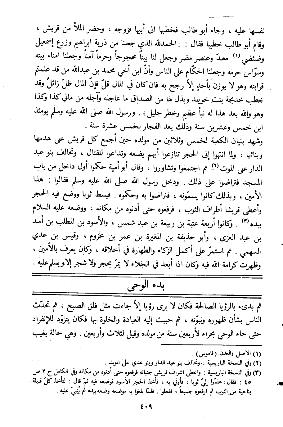 ثم بدئ بالرؤيا الصالحة فكان لا يرى رؤيا إلّا جاءت مثل فلق الصبح، ثم تحدّث الناس بشأن ظهوره ونبوّته، ثم حببت إليه العبادة والخلوة بها فكان يتزوّد للانفراد حتى جاء الوحي بحراء لأربعين سنة من مولده وقيل لثلاث وأربعين. وهي حالة يغيب