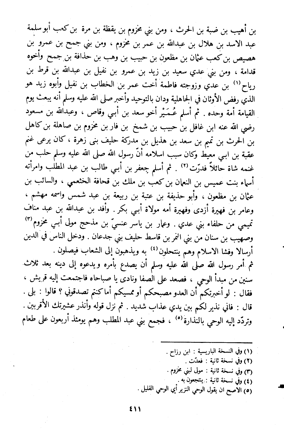 بن أهيب بن ضبة بن الحرث، ومن بني مخزوم بن يقظة بن مرة بن كعب أبو سلمة عبد الأسد بن هلال بن عبد الله بن عمر بن مخزوم، ومن بني جمح بن عمرو بن هصيص بن كعب عثمان بن مظعون بن حبيب بن وهب بن حذافة بن جمح وأخوه قدامة، ومن بني عدي سعيد بن زيد بن عمرو بن نفيل بن عبد الله بن قرط بن رياح [1] بن عدي وزوجته فاطمة أخت عمر بن الخطاب بن نفيل وأبوه زيد هو الّذي رفض الأوثان في الجاهلية ودان بالتوحيد وأخبر صلى الله عليه وسلم أنه يبعث يوم القيامة أمة وحده. ثم أسلم عمير أخو سعد بن أبي وقاص، وعبد الله بن مسعود رضي الله عنه ابن غافل بن حبيب بن شمخ بن فار بن مخزوم بن صاهلة بن كاهل بن الحرث بن تميم بن سعد بن هذيل بن مدركة حليف بنى زهرة، كان يرعى غنم عقبة بن أبي معيط وكان سبب إسلامه أنّ رسول الله صلى الله عليه وسلم حلب من غنمه شاة حائلا فدرّت [2] . ثم أسلم جعفر بن أبي طالب بن عبد المطلب وامرأته أسماء بنت عميس بن النعمان بن كعب بن ملك بن قحافة الخثعميّ، والسائب بن عثمان بن مظعون، وأبو حذيفة بن عتبة بن ربيعة بن عبد شمس واسمه مهشم، وعامر بن فهيرة أزدى وفهيرة أمه مولاة أبي بكر. وأفد بن عبد الله بن عبد مناف تميمي من حلفاء بني عدي. وعمار بن ياسر عنسي بن مذحج مولى أبي مخزوم [3] وصهيب بن سنان من بني النمر بن قاسط حليف بني جدعان. ودخل الناس في الدين أرسالا وفشا الإسلام وهم ينتحلون [4] به ويذهبون إلى الشعاب فيصلون.