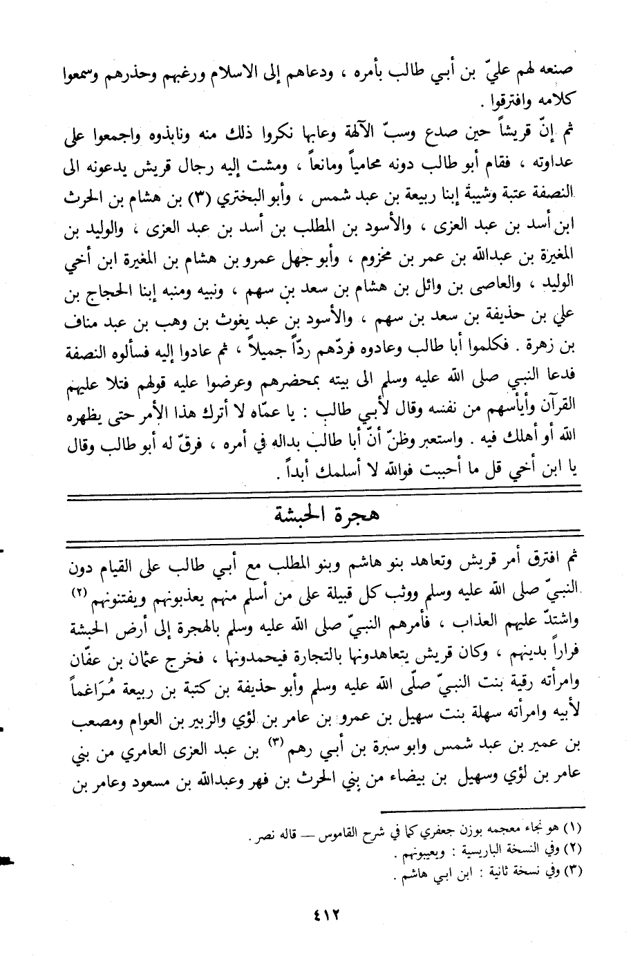 ثم افترق أمر قريش وتعاهد بنو هاشم وبنو المطلب مع أبي طالب على القيام دون النبيّ صلى الله عليه وسلم ووثب كل قبيلة على من أسلم منهم يعذبونهم ويفتنونهم [2] واشتدّ عليهم العذاب، فأمرهم النبيّ صلى الله عليه وسلم بالهجرة إلى أرض الحبشة فرارا بدينهم، وكان قريش يتعاهدونها بالتجارة فيحمدونها، فخرج عثمان بن عفّان وامرأته رقية بنت النبيّ صلّى الله عليه وسلم وأبو حذيفة بن كتبة بن ربيعة مراغما لأبيه وامرأته سهلة بنت سهيل بن عمرو بن عامر بن لؤيّ والزبير بن العوام ومصعب بن عمير بن عبد شمس وابو سبرة بن أبي رهم [3] بن عبد العزى العامري من بني عامر بن لؤيّ وسهيل بن بيضاء من بني الحرث بن فهر وعبد الله بن مسعود وعامر بن