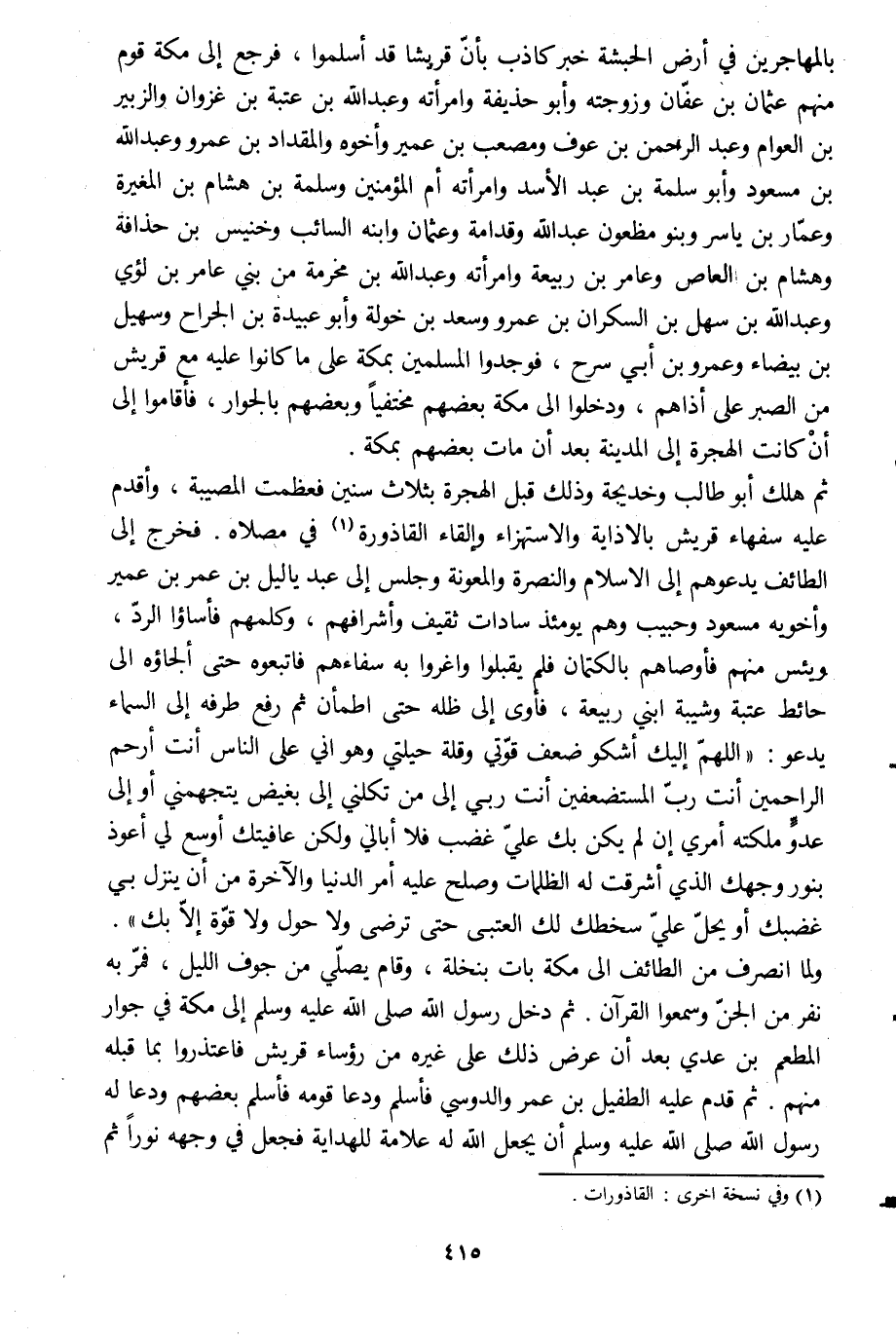ثم هلك أبو طالب وخديجة وذلك قبل الهجرة بثلاث سنين فعظمت المصيبة، وأقدم عليه سفهاء قريش بالاذاية والاستهزاء وإلقاء القاذورة [1] في مصلاه. فخرج إلى الطائف يدعوهم إلى الإسلام والنصرة والمعونة وجلس إلى عبد ياليل بن عمر بن عمير وأخويه مسعود وحبيب وهم يومئذ سادات ثقيف وأشرافهم، وكلمهم فأساءوا الردّ، ويئس منهم فأوصاهم بالكتمان فلم يقبلوا وأغروا به سفاءهم فاتبعوه حتى ألجئوه الى حائط عتبة وشيبة ابني ربيعة، فأوى إلى ظله حتى اطمأن ثم رفع طرفه إلى السماء يدعو: «اللَّهمّ إليك أشكو ضعف قوّتي وقلة حيلتي وهو اني على الناس أنت أرحم الراحمين أنت ربّ المستضعفين أنت ربي إلى من تكلني إلى بغيض يتجهمني أو إلي عدوّ ملكته أمري إن لم يكن بك عليّ غضب فلا أبالي ولكن عافيتك أوسع لي أعوذ بنور وجهك الّذي أشرقت له الظلمات وصلح عليه أمر الدنيا والآخرة من أن ينزل بي غضبك أو يحلّ عليّ سخطك لك العتبى حتى ترضى ولا حول ولا قوّة إلّا بك» .