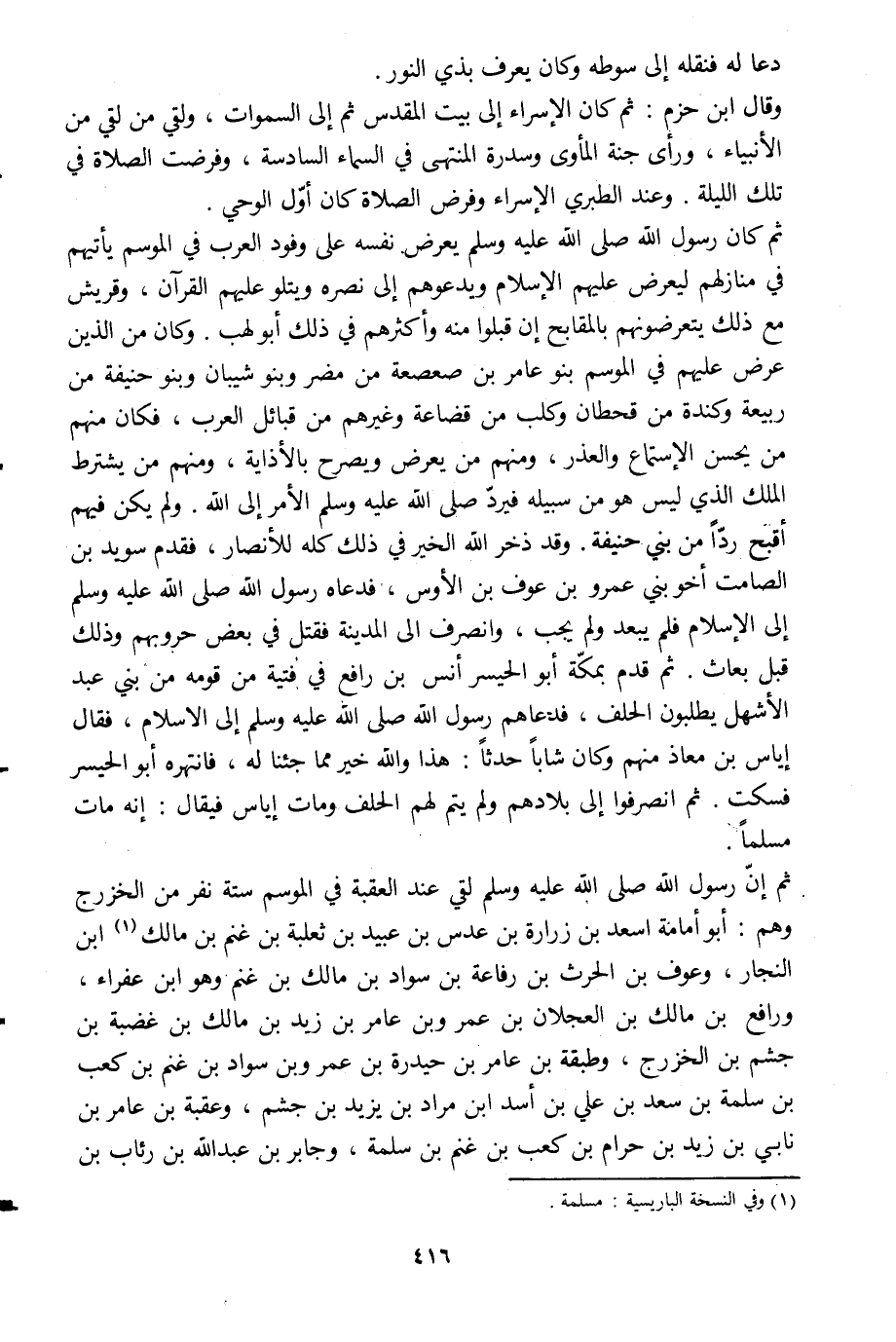 ثم كان رسول الله صلى الله عليه وسلم يعرض نفسه على وفود العرب في الموسم يأتيهم في منازلهم ليعرض عليهم الإسلام ويدعوهم إلى نصره ويتلو عليهم القرآن، وقريش مع ذلك يتعرضونهم بالمقابح إن قبلوا منه وأكثرهم في ذلك أبو لهب. وكان من الذين عرض عليهم في الموسم بنو عامر بن صعصعة من مضر وبنو شيبان وبنو حنيفة من ربيعة وكندة من قحطان وكلب من قضاعة وغيرهم من قبائل العرب، فكان منهم من يحسن الاستماع والعذر، ومنهم من يعرض ويصرح بالإذاية، ومنهم من يشترط الملك الّذي ليس هو من سبيله فيردّ صلى الله عليه وسلم الأمر إلى الله. ولم يكن فيهم أقبح ردّا من بني حنيفة. وقد ذخر الله الخير في ذلك كله للأنصار، فقدم سويد بن الصامت أخو بني عمرو بن عوف بن الأوس، فدعاه رسول الله صلى الله عليه وسلم إلى الإسلام فلم يبعد ولم يجب، وانصرف الى المدينة فقتل في بعض خروبهم وذلك قبل بعاث. ثم قدم بمكّة أبو الحيسر أنس بن رافع في فتية من قومه من بني عبد الأشهل يطلبون الحلف، فدعاهم رسول الله صلى الله عليه وسلم إلى الإسلام، فقال إياس بن معاذ منهم وكان شابا حدثا: هذا والله خير مما جئنا له، فانتهره أبو الحيسر فسكت. ثم انصرفوا إلى بلادهم ولم يتم لهم الحلف ومات إياس فيقال: إنه مات مسلما.