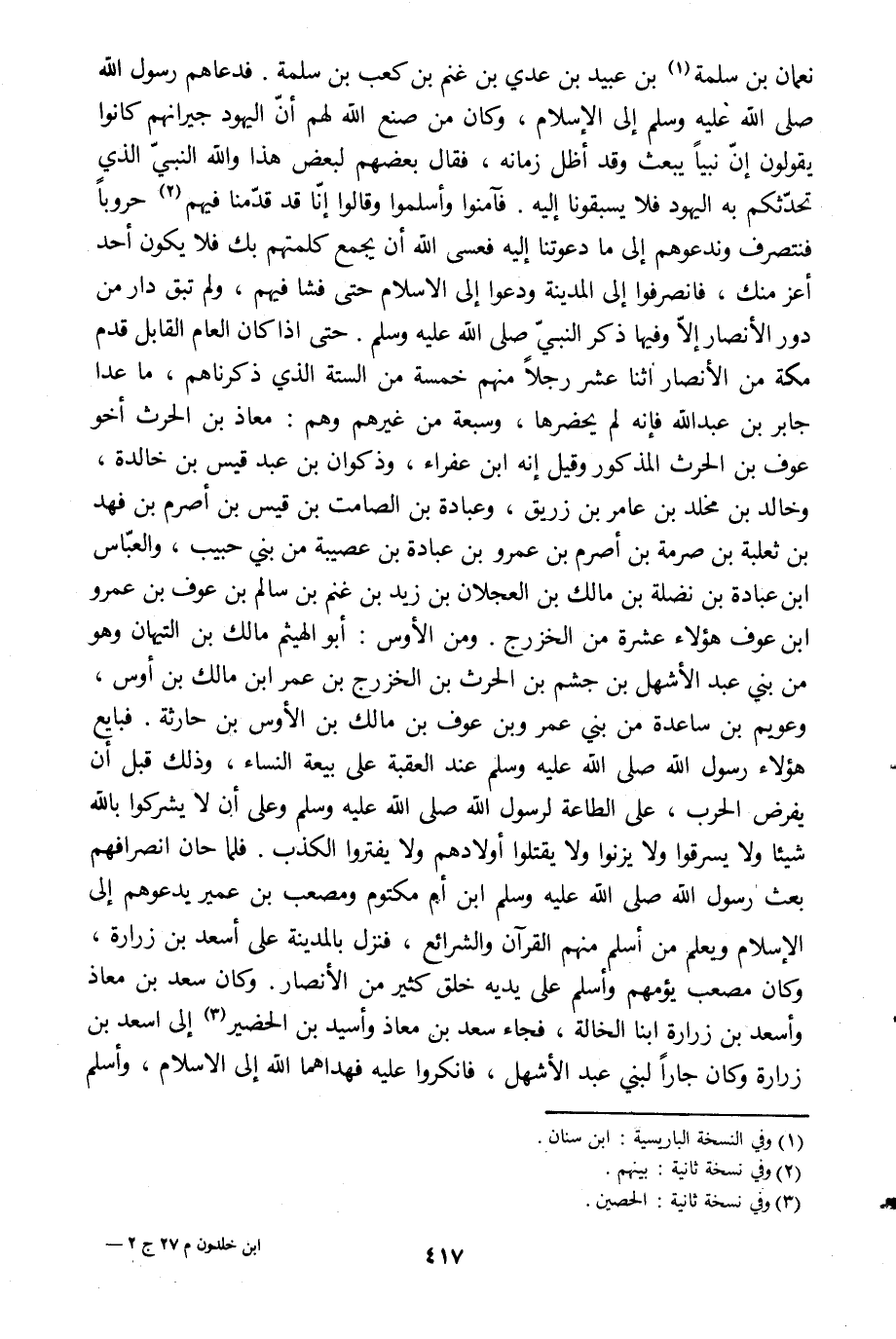 نعمان بن سلمة [1] بن عبيد بن عدي بن غنم بن كعب بن سلمة. وفدعاهم رسول الله صلى الله عليه وسلم إلى الإسلام، وكان من صنع الله لهم أنّ اليهود جيرانهم كانوا يقولون إنّ نبيا يبعث وقد أظل زمانه، فقال بعضهم لبعض هذا والله النبيّ الّذي تحدّثكم به اليهود فلا يسبقونا إليه. فآمنوا وأسلموا وقالوا إنّا قد قدّمنا فيهم [2] حروبا فنتصرف وندعوهم إلى ما دعوتنا إليه فعسى الله أن يجمع كلمتهم بك فلا يكون أحد أعز منك، فانصرفوا إلى المدينة ودعوا إلى السلام حتى فشا فيهم، ولم تبق دار من دور الأنصار إلّا وفيها ذكر النبيّ صلى الله عليه وسلم. حتى إذا كان العام القابل قدم مكة من الأنصار اثنا عشر رجلا منهم خمسة من الستة الّذي ذكرناهم، ما عدا جابر بن عبد الله فإنه لم يحضرها، وسبعة من غيرهم وهم: معاذ بن الحرث أخو عوف بن الحرث المذكور وقيل إنه ابن عفراء، وذكوان بن عبد قيس بن خالدة، وخالد بن مخلد بن عامر بن زريق، وعبادة بن الصامت بن قيس بن أصرم بن فهد بن ثعلبة بن صرمة بن أصرم بن عمرو بن عبادة بن عصيبة من بني حبيب، والعبّاس ابن عبادة بن نضلة بن مالك بن العجلان بن زيد بن غنم بن سالم بن عوف بن عمرو ابن عوف هؤلاء عشرة من الخزرج. ومن الأوس: أبو الهيثم مالك بن التيهان وهو من بني عبد الأشهل بن جشم بن الحرث بن الخزرج بن عمر ابن مالك بن أوس، وعويم بن ساعدة من بني عمر وبن عوف بن مالك بن الأوس بن حارثة. فبايع هؤلاء رسول الله صلى الله عليه وسلم عند العقبة على بيعة النساء، وذلك قبل أن يفرض الحرب، على الطاعة لرسول الله صلى الله عليه وسلم وعلى أن لا يشركوا باللَّه شيئا ولا يسرقوا ولا يزنوا ولا يقتلوا أولادهم ولا يفتروا الكذب. فلما حان انصرافهم بعث رسول الله صلى الله عليه وسلم ابن أم مكتوم ومصعب بن عمير يدعوهم إلى الإسلام ويعلم من أسلم منهم القرآن والشرائع، فنزل بالمدينة على أسعد بن زرارة، وكان مصعب يؤمهم وأسلم على يديه خلق كثير من الأنصار. وكان سعد بن معاذ وأسعد بن زرارة ابنا الخالة، فجاء سعد بن معاذ وأسيد بن الحضير [3] إلى أسعد بن زرارة وكان جارا لبني عبد الأشهل، فأنكروا عليه فهداهما الله إلى السلام، وأسلم