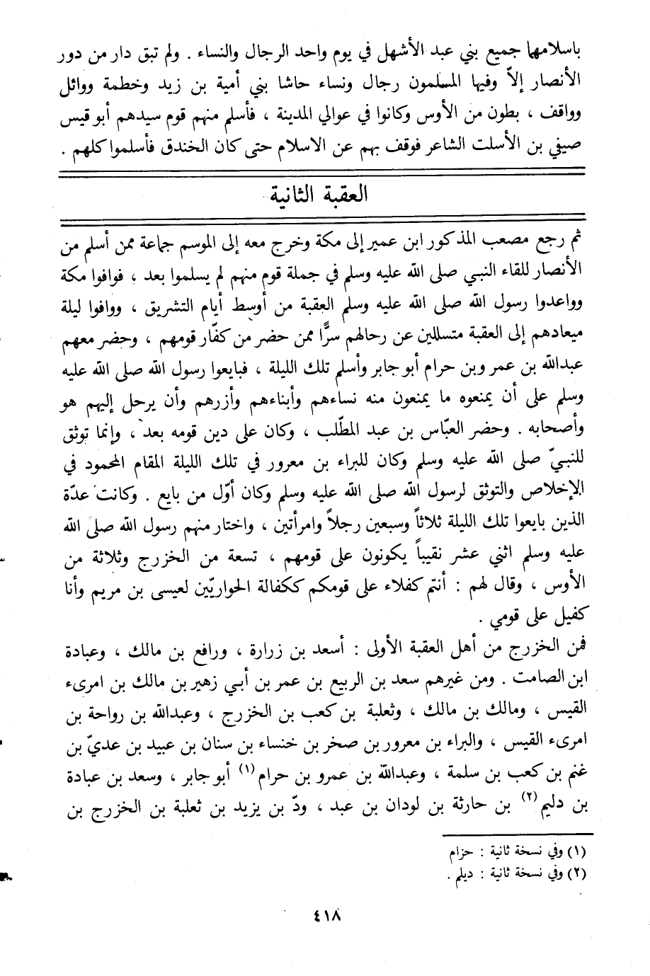 ثم رجع مصعب المذكور ابن عمير إلى مكة وخرج معه إلى الموسم جماعة ممن أسلم من الأنصار للقاء النبي صلى الله عليه وسلم في جملة قوم منهم لم يسلموا بعد، فوافوا مكة وواعدوا رسول الله صلى الله عليه وسلم العقبة من أوسط أيام التشريق، ووافوا ليلة ميعادهم إلى العقبة متسللين عن رحالهم سرّا ممن حضر من كفّار قومهم، وحضر معهم عبد الله بن عمرو بن حرام أبو جابر وأسلم تلك الليلة، فبايعوا رسول الله صلى الله عليه وسلم على أن يمنعوه ما يمنعون منه نساءهم وأبناءهم وأزرهم وأن يرحل إليهم هو وأصحابه. وحضر العبّاس بن عبد المطّلب، وكان على دين قومه بعد، وإنما توثق للنبيّ صلى الله عليه وسلم وكان للبراء بن معرور في تلك الليلة المقام المحمود في الإخلاص والتوثق لرسول الله صلى الله عليه وسلم وكان أوّل من بايع. وكانت عدّة الذين بايعوا تلك الليلة ثلاثا وسبعين رجلا وامرأتين، واختار منهم رسول الله صلى الله عليه وسلم اثني عشر نقيبا يكونون على قومهم، تسعة من الخزرج وثلاثة من الأوس، وقال لهم: أنتم كفلاء على قومكم ككفالة الحواريّين لعيسى بن مريم وأنا كفيل على قومي. فمن الخزرج من أهل العقبة الأولى: أسعد بن زرارة، ورافع بن مالك، وعبادة ابن الصامت. ومن غيرهم سعد بن الربيع بن عمر بن أبي زهير بن مالك بن امرئ القيس، ومالك بن مالك، وثعلبة بن كعب بن الخزرج، وعبد الله بن رواحة بن امرئ القيس، والبراء بن معرور بن صخر بن خنساء بن سنان بن عبيد بن عديّ بن غنم بن كعب بن سلمة، وعبد الله بن عمرو بن حرام [1] أبو جابر، وسعد بن عبادة بن دليم [2] بن حارثة بن لودان بن عبد، ودّ بن يزيد بن ثعلبة بن الخزرج بن