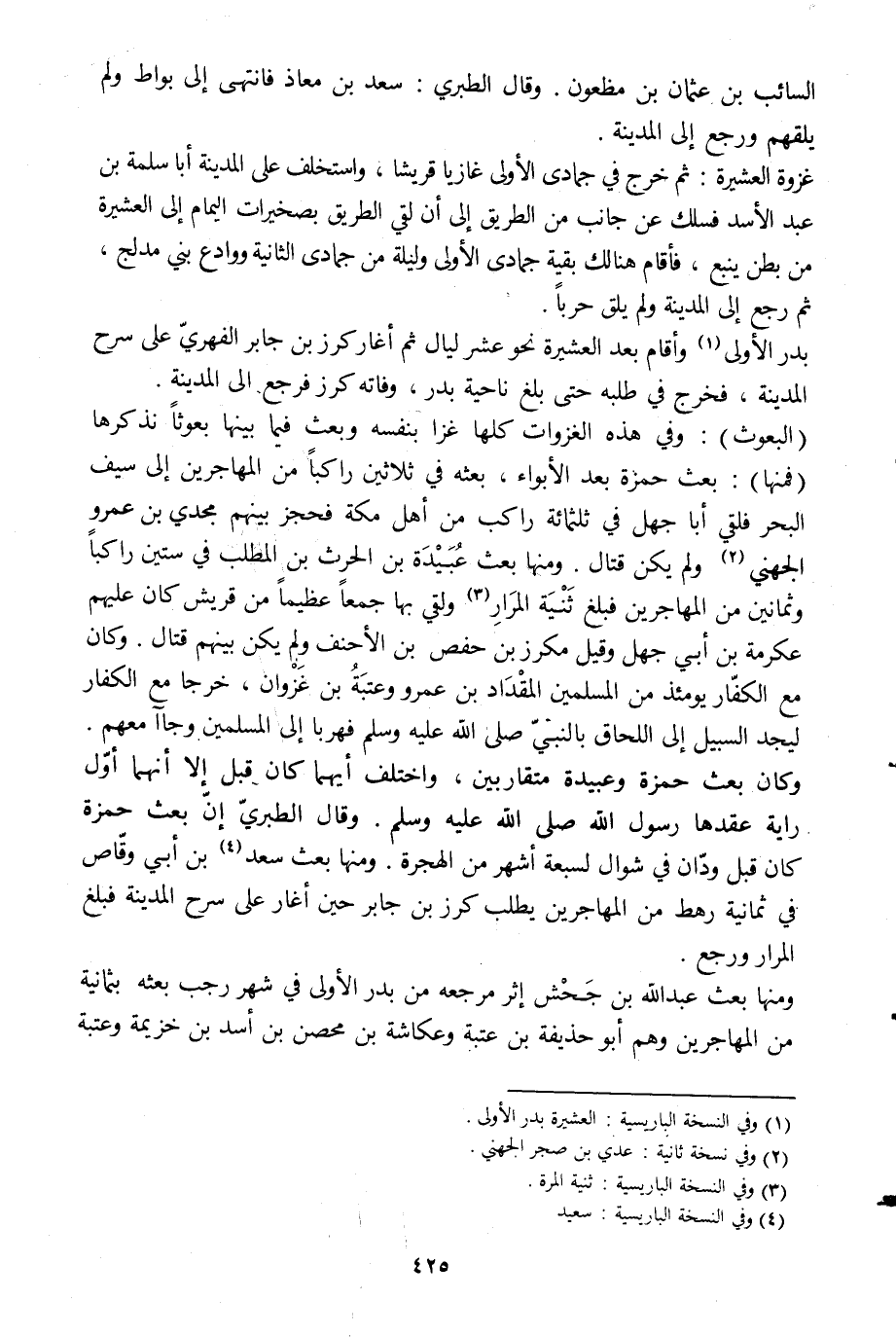 وكان بعث حمزة وعبيدة متقاربين، واختلف أيهما كان قبل إلا أنهما أوّل راية عقدها رسول الله صلى الله عليه وسلم. وقال الطبريّ إنّ بعث حمزة كان قبل ودّان في شوال لسبعة أشهر من الهجرة. ومنها بعث سعد [4] بن أبي وقّاص في ثمانية رهط من المهاجرين يطلب كرز بن جابر حين أغار على سرح المدينة فبلغ المرار ورجع.