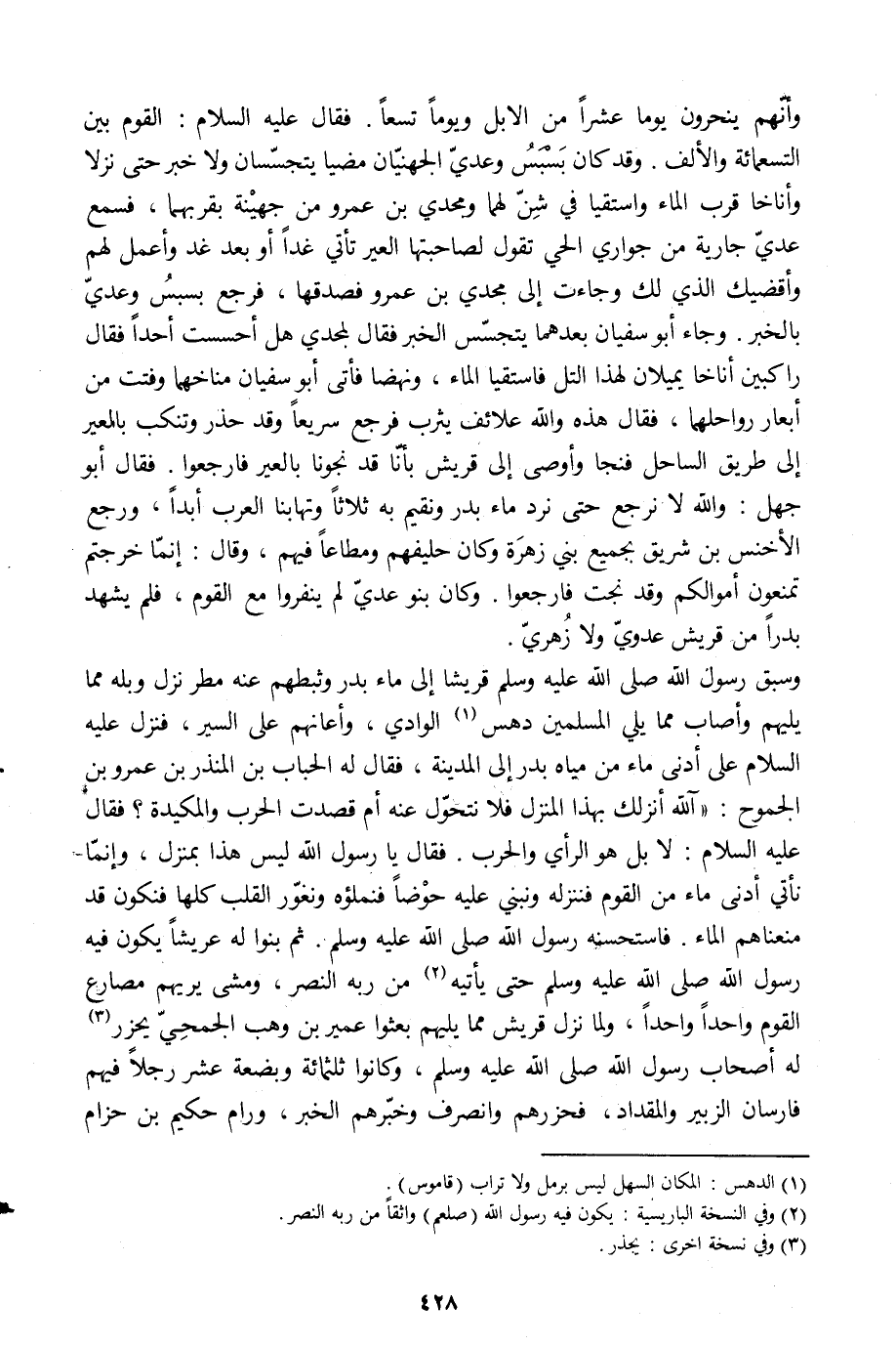 وأنّهم ينحرون يوما عشرا من الإبل ويوما تسعا. فقال عليه السلام: القوم بين التسعمائة والألف. وقد كان بسبس وعديّ الجهنيّان مضيا يتجسّسان ولا خبر حتى نزلا وأناخا قرب الماء واستقيا في شنّ لهما ومجدي بن عمرو بن جهينة بقربهما، فسمع عديّ جارية من جواري الحي تقول لصاحبتها العير تأتي غدا أو بعد غد وأعمل لهم وأقضيك الّذي لك وجاءت إلى مجدي بن عمرو فصدقها، فرجع بسبب وعديّ بالخبر. وجاء أبو سفيان بعدهما يتجسّس الخبر فقال لمجدي هل أحسست أحدا فقال راكبين أناخا يميلان لهذا التل فاستقيا الماء، ونهضا فأتى أبو سفيان مناخهما وفتت من أبعار رواحلهما، فقال هذه والله علائف يثرب فرجع سريعا وقد حذر وتنكب بالعير إلى طريق الساحل فنجا وأوصى إلى قريش بأنّا قد نجونا بالعير فارجعوا. فقال أبو جهل: والله لا نرجع حتى نرد ماء بدر ونقيم به ثلاثا وتهابنا العرب أبدا، ورجع الأخنس بن شريق بجميع بني زهرة وكان حليفهم ومطاعا فيهم، وقال: إنّما خرجتم تمنعون أموالكم وقد نجت فارجعوا. وكان بنو عديّ لم ينفروا مع القوم، فلم يشهد بدرا من قريش عدويّ ولا زهريّ.