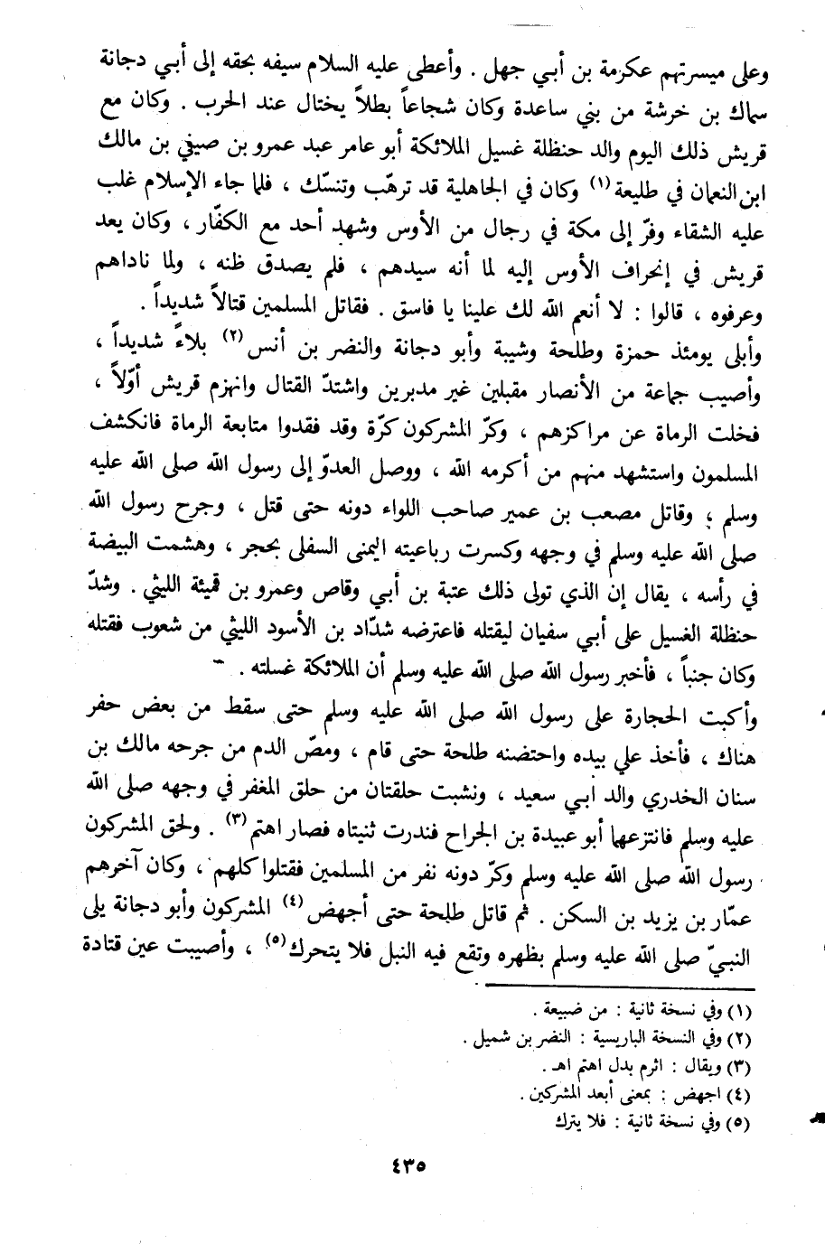 وأبلى يومئذ حمزة وطلحة وشيبة وأبو دجانة والنضر بن أنس [2] بلاء شديدا، وأصيب جماعة من الأنصار مقبلين غير مدبرين واشتدّ القتال وانهزم قريش أوّلا، فخلت الرماة عن مراكزهم، وكرّ المشركون كرّة وقد فقدوا متابعة الرماة فانكشف المسلمون واستشهد منهم من أكرمه الله، ووصل العدوّ إلى رسول الله صلى الله عليه وسلم، وقاتل مصعب بن عمير صاحب اللواء دونه حتى قتل، وجرح رسول الله صلى الله عليه وسلم في وجهه وكسرت رباعيته اليمنى السفلى بحجر، وهشمت البيضة في رأسه، يقال إن الّذي تولى ذلك عتبة بن أبي وقاص وعمرو بن قميئة الليثي. وشدّ حنظلة الغسيل على أبي سفيان ليقتله فاعترضه شدّاد بن الأسود الليثي من شعوب فقتله وكان جنبا، فأخبر رسول الله صلى الله عليه وسلم أن الملائكة غسلته.