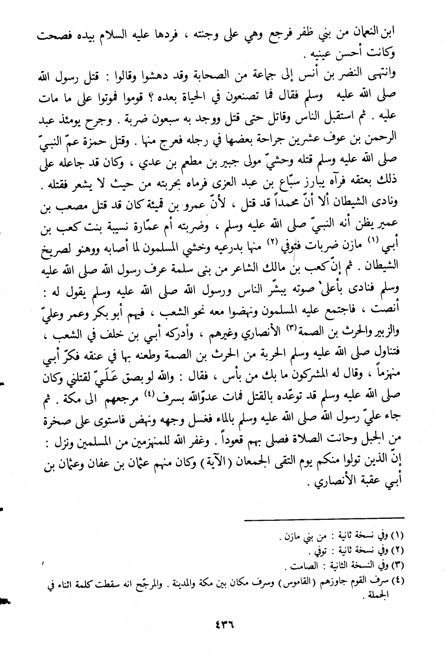 ونادي الشيطان ألا أنّ محمدا قد قتل، لأنّ عمرو بن قميئة كان قد قتل مصعب بن عمير يظن أنه النبيّ صلى الله عليه وسلم، وضربته أم عمّارة نسيبة بنت كعب بن أبي [1] مازن ضربات فتوفي [2] منها بدرعيه وخشي المسلمون لما أصابه ووهنوز لصريخ الشيطان. ثم إنّ كعب بن مالك الشاعر من بنى سلمة عرف رسول الله صلى الله عليه وسلم فنادى بأعلى صوته يبشّر الناس ورسول الله صلى الله عليه وسلم يقول له: