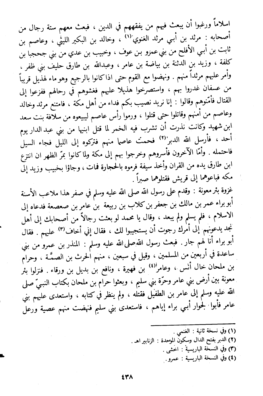 وقدم على رسول الله صلى الله عليه وسلم في صفر هذا ملاعب الأسنة أبو براء عمر بن مالك بن جعفر بن كلاب بن ربيعة بن عامر بن صعصعة فدعاه إلى الإسلام، فلم يسلم ولم يبعد، وقال يا محمد لو بعثت رجالا من أصحابك إلى أهل نجد يدعونهم إلى أمرك رجوت أن يستجيبوا لك، فقال إنّي أخاف [3] عليهم. فقال أبو براء أنا لهم جار. فبعث رسول الله صلى الله عليه وسلم: المنذر بن عمرو بن بني ساعدة في أربعين من المسلمين، وقيل في سبعين، منهم الحرث بن الصمّة، وحرام بن ملحان خال أنس، وعامر [4] بن فهيرة، ونافع بن بديل بن ورقاء. فنزلوا بئر معونة بين أرض بني عامر وحرّة بني سليم، وبعثوا حرام بن ملحان بكتاب النبيّ صلى الله عليه وسلم إلى عامر بن الطفيل فقتله، ولم ينظر في كتابه، واستعدى عليهم بني عامر فأبوا لجوار أبي براء إياهم، فاستعدى بني سليم فنهضت منهم عصية ورعل