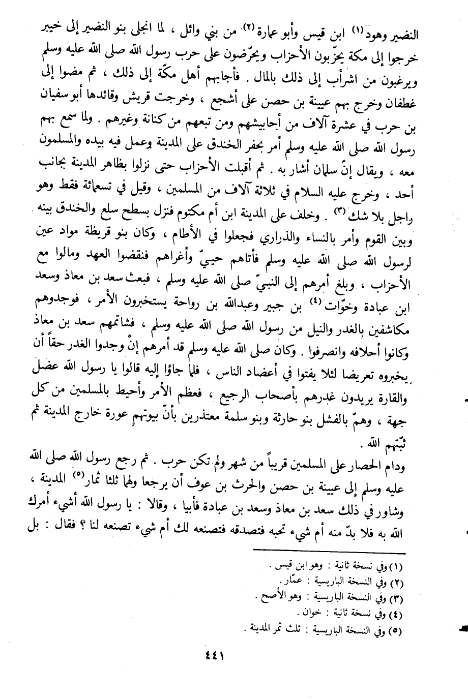 النضير وهود [1] ابن قيس وأبو عمارة [2] من بني وائل، لما انجلى بنو النضير إلى خيبر خرجوا إلى مكة يحزّبون الأحزاب ويحرّضون على حرب رسول الله صلى الله عليه وسلم ويرغبون من اشرأب إلى ذلك بالمال. فأجابهم أهل مكة إلى ذلك، ثم مضوا إلى غطفان وخرج بهم عيينة بن حصن على أشجع، وخرجت قريش وقائدها أبو سفيان بن حرب في عشرة آلاف من أحابيشهم ومن تبعهم من كنانة وغيرهم. ولما سمع بهم رسول الله صلى الله عليه وسلم أمر بحفر الخندق على المدينة وعمل فيه بيده والمسلمون معه، ويقال إنّ سلمان أشار به. ثم أقبلت الأحزاب حتى نزلوا بظاهر المدينة بجانب أحد، وخرج عليه السلام في ثلاثة آلاف من المسلمين، وقيل في تسعمائة فقط وهو راجل بلا شك [3] . وخلف على المدينة ابن أم مكتوم فنزل بسطح سلع والخندق بينه وبين القوم وأمر بالنساء والذراري فجعلوا في الآطام، وكان بنو قريظة مواد عين لرسول الله صلى الله عليه وسلم فأتاهم حييّ وأغراهم فنقضوا العهد ومالوا مع الأحزاب، وبلغ أمرهم إلي النبيّ صلى الله عليه وسلم، فبعث سعد بن معاذ وسعد ابن عبادة وخوّات [4] بن جبير وعبد الله بن رواحة يستخبرون الأمر، فوجدوهم مكاشفين بالغدر والنيل من رسول الله صلى الله عليه وسلم، فشاتمهم سعد بن معاذ وكانوا أحلافه وانصرفوا. وكان صلى الله عليه وسلم قد أمرهم إن وجدوا الغدر حقا أن يخبروه تعريضا لئلا يفتوا في أعضاد الناس، فلما جاءوا إليه قالوا يا رسول الله عضل والقارة يريدون غدرهم بأصحاب الرجيع، فعظم الأمر وأحيط بالمسلمين من كل جهة، وهمّ بالفشل بنو حارثة وبنو سلمة معتذرين بأنّ بيوتهم عورة خارج المدينة ثم ثبّتهم الله.