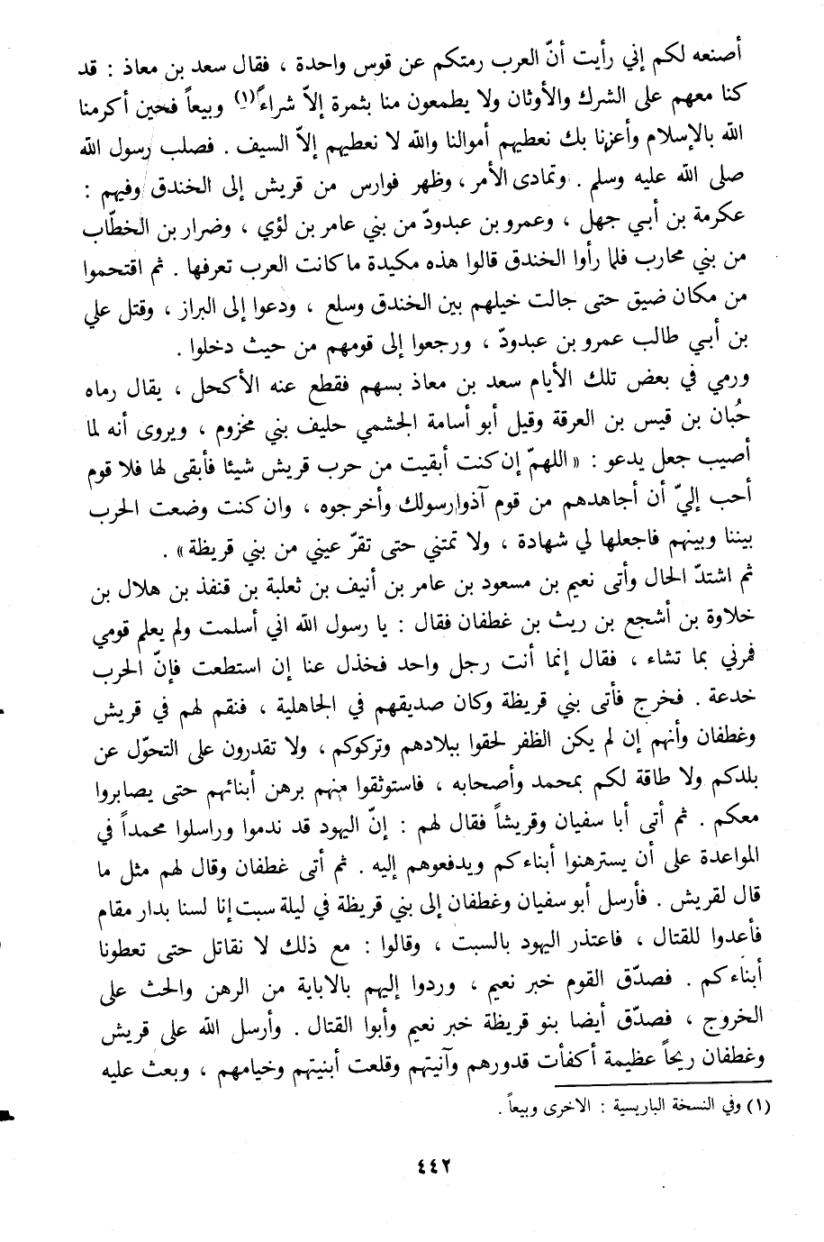 أصنعه لكم إني رأيت أنّ العرب رمتكم عن قوس واحدة، فقال سعد بن معاذ: قد كنا معهم على الشرك والأوثان ولا يطمعون منا بثمرة إلّا شراء [1] وبيعا فحين أكرمنا الله بالإسلام وأعزنا بك نعطيهم أموالنا والله لا نعطيهم إلّا السيف. فصلب رسول الله صلى الله عليه وسلم. وتمادى الأمر، وظهر فوارس من قريش إلى الخندق وفيهم: