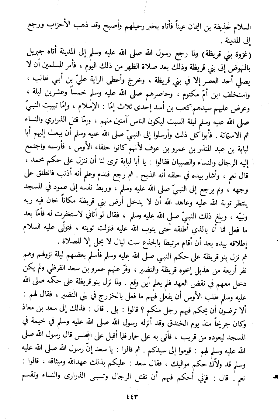 ولما رجع رسول الله صلى الله عليه وسلم إلى المدينة أتاه جبريل بالنهوض إلى بني قريظة وذلك بعد صلاة الظهر من ذلك اليوم، فأمر المسلمين أن لا يصلي أحد العصر إلا في بني قريظة، وخرج وأعطى الراية عليّ بن أبي طالب، واستخلف ابن أمّ مكتوم، وحاصرهم صلى الله عليه وسلم خمسا وعشرين ليلة، وعرض عليهم سيدهم كعب بن أسد إحدى ثلاث إمّا: الإسلام، وإمّا تبييت النبيّ صلى الله عليه وسلم ليلة السبت ليكون الناس آمنين منهم، وإمّا قتل الذراري والنساء ثم الاستماتة. فأبوا كل ذلك وأرسلوا إلى النبيّ صلى الله عليه وسلم أن يبعث إليهم أبا لبابة بن عبد المنذر بن عمرو بن عوف لأنهم كانوا حلفاء الأوس، فأرسله واجتمع إليه الرجال والنساء والصبيان فقالوا: يا أبا لبابة ترى لنا أن ننزل على حكم محمد، قال نعم، وأشار بيده في حلقه أنه الذبح. ثم رجع فندم وعلى أنه أذنب فانطلق على وجهه، ولم يرجع إلى النبيّ صلى الله عليه وسلم، وربط نفسه إلى عمود في المسجد ينتظر توبة الله عليه وعاهد الله أن لا يدخل أرض بني قريظة مكانا خان فيه ربه ونبيّه، وبلغ ذلك النبيّ صلى الله عليه وسلم، فقال لو أتاني لاستغفرت له فأمّا بعد ما فعل فما أنا بالذي أطلقه حتى يتوب الله عليه فنزلت توبته، فتولّى عليه السلام إطلاقه بيده بعد أن أقام مرتبطا بالجذع ست ليال لا يحل إلا للصلاة. ثم نزل بنو قريظة على حكم النبي صلى الله عليه وسلم فأسلم بعضهم ليلة نزولهم وهم نفر أربعة من هذيل إخوة قريظة والنضير، وفرّ عنهم عمرو بن سعد القرظي ولم يكن دخل معهم في نقض العهد فلم يعلم أين وقع. ولما نزل بنو قريظة على حكمه صلى الله عليه وسلم طلب الأوس أن يفعل فيهم ما فعل بالخزرج في بني النضير، فقال لهم: