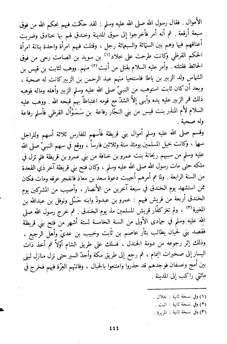 الأموال. فقال رسول الله صلى الله عليه وسلم: لقد حكمت فيهم بحكم الله من فوق سبعة أرقعة. ثم أنه أمر فأخرجوا إلى سوق المدينة وخندق لهم بها خنادق وضربت أعناقهم فيها وهم بين الستمائة والسبعمائة رجل، وقتلت فيهم امرأة واحدة بنانة امرأة الحكم القرظي وكانت طرحت على خلاد [1] بن سويد بن الصامت رحى من فوق الحائط فقتلته. وأمر عليه السلام بقتل من أنبت [2] منهم. ووهب لثابت بن قيس بن الشماس ولد الزبير بن ياطا فاستحيا منهم عبد الرحمن بن الزبير كانت له صحبة، وبعد أن كان ثابت استوهب من النبيّ صلى الله عليه وسلم الزبير وأهله وماله فوهبه ذلك فمر الزبير عليه يده وأبي إلّا الشدّ مع قومه اغتباطا بهم قبحه الله. ووهب عليه السلام لأم المنذر بنت قيس من بني النجّار رفاعة بن سموأل القرظي فأسلم رفاعة وله صحبة.