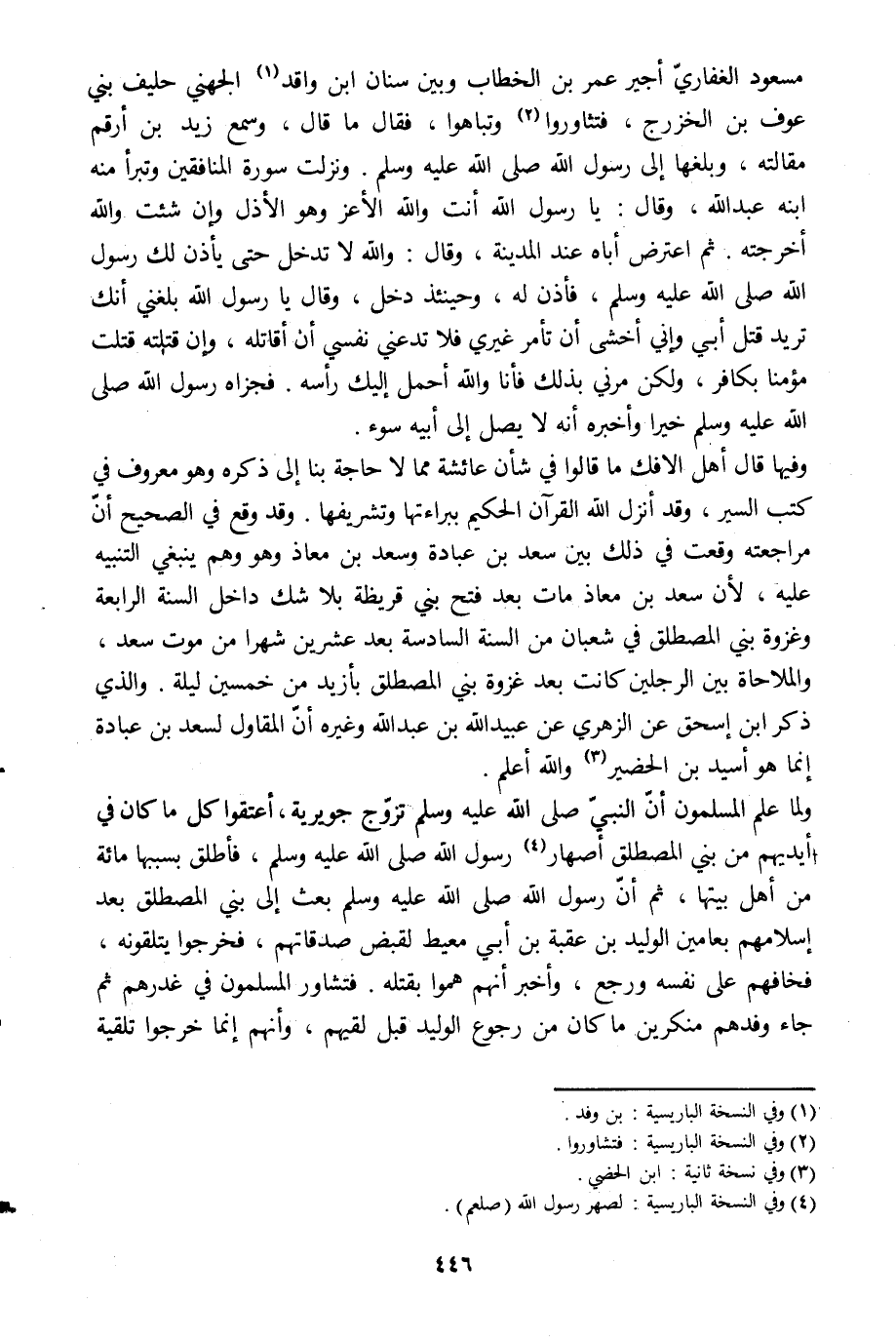 مسعود الغفّاريّ أجير عمر بن الخطاب وبين سنان ابن واقد [1] الجهنيّ حليف بني عوف بن الخزرج، فتثاوروا [2] وتباهوا، فقال ما قال: وسمع زيد بن أرقم مقالته، وبلغها إلى رسول الله صلى الله عليه وسلم. ونزلت سورة المنافقين وتبرأ منه ابنه عبد الله، وقال: يا رسول الله أنت والله الأعز وهو الأذل وإن شئت والله أخرجته. ثم اعترض أباه عند المدينة، وقال: والله لا تدخل حتى يأذن لك رسول الله صلى الله عليه وسلم، فأذن له، وحينئذ دخل، وقال يا رسول الله بلغني أنك تريد قتل أبي وإني أخشى أن تأمر غيري فلا تدعني نفسي أن أقاتله، وإن قتلته قتلت مؤمنا بكافر، ولكن مرني بذلك فأنا والله أحمل إليك رأسه. فجزاه رسول الله صلى الله عليه وسلم خيرا وأخبره أنه لا يصل إلى أبيه سوء.