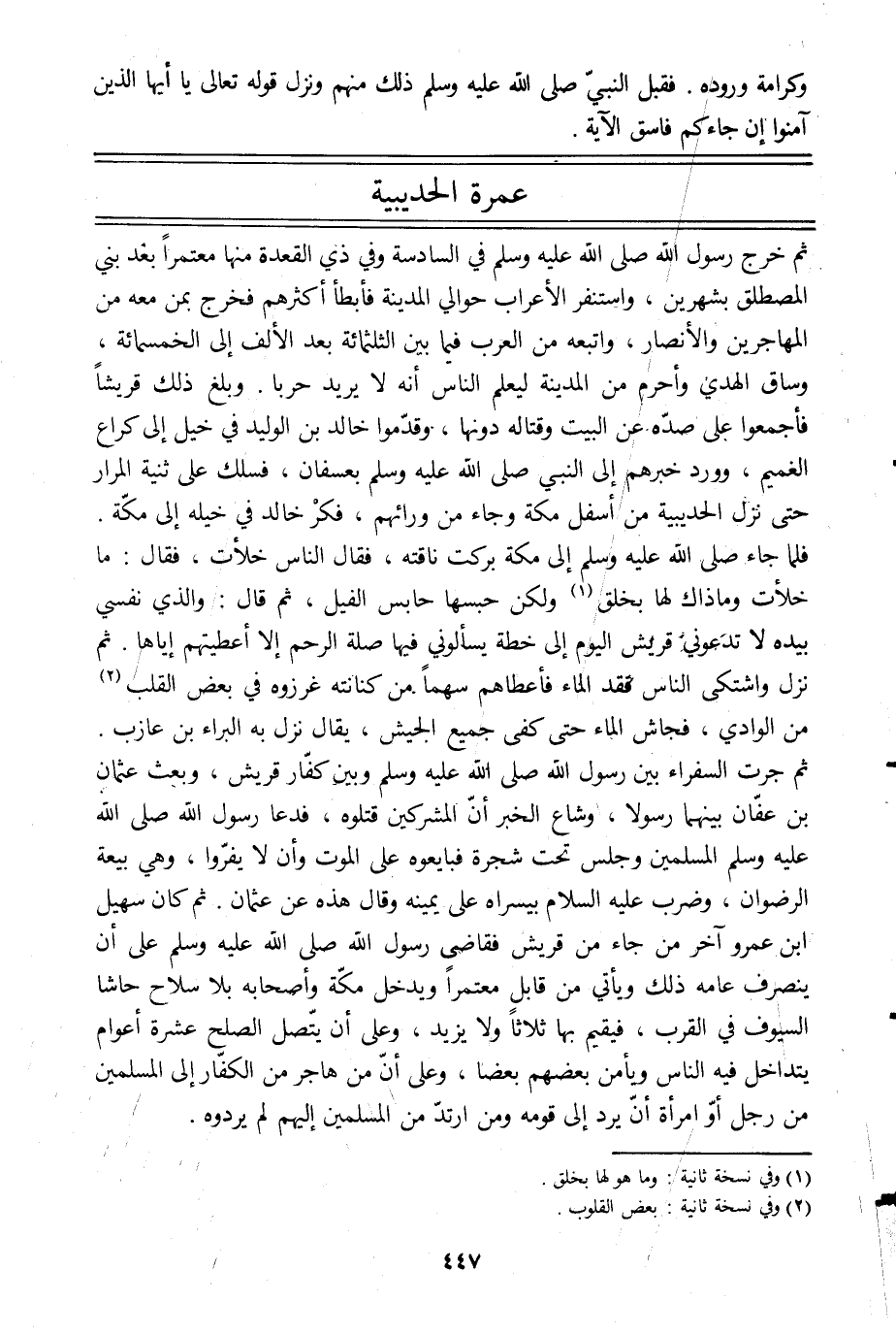 ثم خرج رسول الله صلى الله عليه وسلم في السادسة وفي ذي القعدة منها معتمرا بعد بني المصطلق بشهرين، واستنفر الأعراب حوالي المدينة فأبطأ أكثرهم فخرج بمن معه من المهاجرين والأنصار، واتبعه من العرب فيما بين الثلاثمائة بعد الألف إلى الخمسمائة، وساق الهدي وأحرم من المدينة ليعلم الناس أنه لا يريد حربا. وبلغ ذلك قريشا فأجمعوا على صدّه عن البيت وقتاله دونها، وقدّموا خالد بن الوليد في خيل إلى كراع الغميم، وورد خبرهم إلى النبي صلى الله عليه وسلم بعسفان، فسلك على ثنية المرار حتى نزل الحديبيّة من أسفل مكة وجاء من ورائهم، فكر خالد في خيله إلى مكّة.
