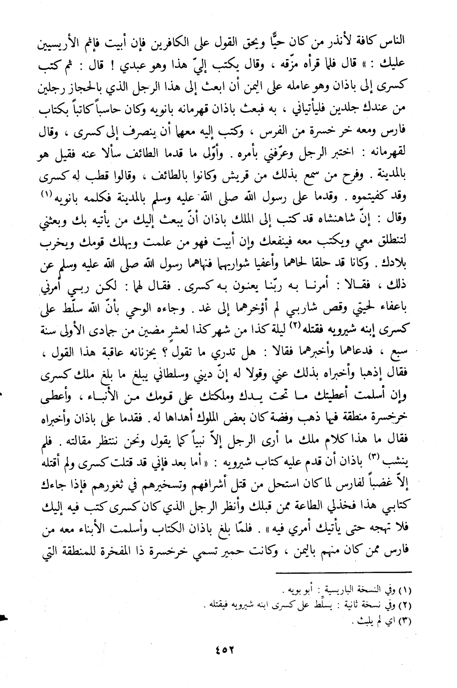 الناس كافة لأنذر من كان حيّا ويحق القول على الكافرين فإن أبيت فإثم الأريسيين عليك:» قال فلما قرأه مزّقه، وقال يكتب إليّ هذا وهو عبدي! قال: ثم كتب كسرى إلى باذان وهو عامله على اليمن أن ابعث إلى هذا الرجل الّذي بالحجاز رجلين من عندك جلدين فليأتياني، به فبعث باذان قهرمانه بانويه وكان حاسبا كاتبا بكتاب فارس ومعه خرخسرة من الفرس، وكتب إليه معهما أن ينصرف إلى كسرى، وقال لقهرمانه: اختبر الرجل وعرّفني بأمره. وأوّل ما قدما الطائف سألا عنه فقيل هو بالمدينة. وفرح من سمع بذلك من قريش وكانوا بالطائف، وقالوا قطب له كسرى وقد كفيتموه. وقدما على رسول الله صلى الله عليه وسلم بالمدينة فكلمه بانويه [1] وقال: إنّ شاهنشاه قد كتب إلى الملك باذان أنّ يبعث إليك من يأتيه بك وبعثني لتنطلق معي ويكتب معه فينفعك وإن أبيت فهو من علمت ويهلك قومك ويخرب بلادك. وكانا قد حلقا لحاهما وأعفيا شواربهما فنهاهما رسول الله صلى الله عليه وسلم عن ذلك، فقالا: أمرنا به ربّنا يعنون به كسرى. فقال لهما: لكن ربي أمرني بإعفاء لحيتي وقص شاربي لم أؤخرهما إلى غد. وجاءه الوحي بأنّ الله سلّط على كسرى ابنه شيرويه فقتله [2] ليلة كذا من شهر كذا لعشر مضين من جمادى الأولى سنة سبع، فدعاهما وأخبرهما فقالا: هل تدري ما تقول؟ يحزنانه عاقبة هذا القول، فقال اذهبا وأخبراه بذلك عني وقولا له إنّ ديني وسلطاني يبلغ ما بلغ ملك كسرى وإن أسلمت أعطيتك ما تحت يدك وملكتك على قومك من الأنباء، وأعطى خرخسرة منطقة فيها ذهب وفضة كان بعض الملوك أهداها له. فقدما على باذان وأخبراه فقال ما هذا كلام ملك ما أرى الرجل إلّا نبيا كما يقول ونحن ننتظر مقالته. فلم ينشب [3] بأذان أن قدم عليه كتاب شيرويه: «أما بعد فإنّي قد قتلت كسرى ولم أقتله إلّا غضبا لفارس لما كان استحل من قتل أشرافهم وتسخيرهم في ثغورهم فإذا جاءك كتابي هذا فخذ لي الطاعة ممن قبلك وانظر الرجل الّذي كان كسرى كتب فيه إليك فلا تهجه حتى يأتيك أمري فيه» . فلمّا بلغ باذان الكتاب وأسلمت الأبناء معه من فارس ممن كان منهم باليمن، وكانت حمير تسمي خرخسرة ذا المفخرة للمنطقة التي