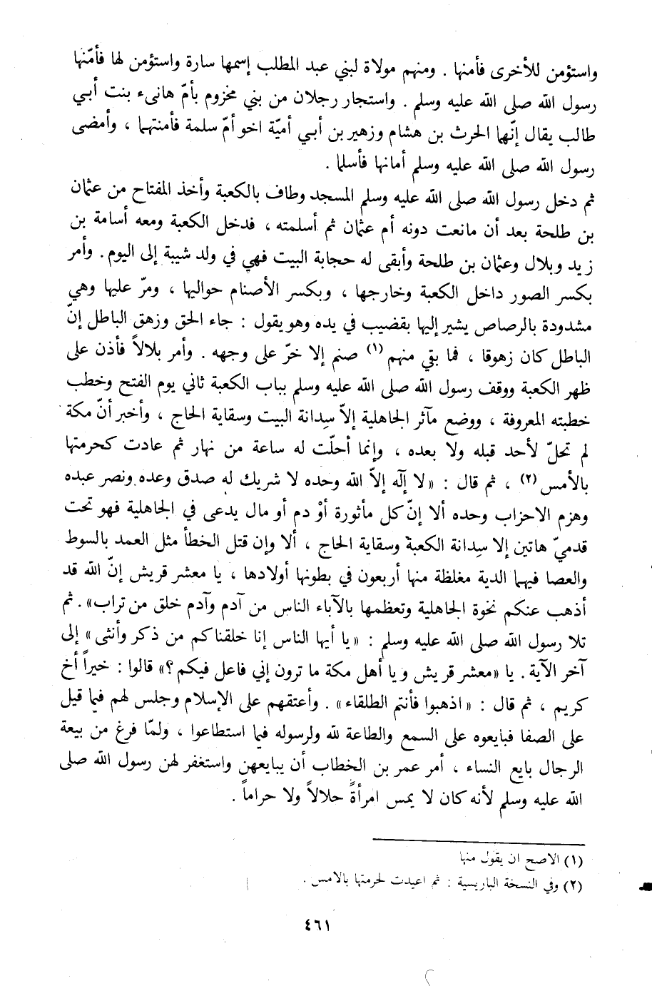 ثم دخل رسول الله صلى الله عليه وسلم المسجد وطاف بالكعبة وأخذ المفتاح من عثمان بن طلحة بعد أن مانعت دونه أم عثمان ثم أسلمته، فدخل الكعبة ومعه أسامة بن زيد وبلال وعثمان بن طلحة وأبقى له حجابة البيت فهي في ولد شيبة إلى اليوم. وأمر بكسر الصور داخل الكعبة وخارجها، وبكسر الأصنام حواليها، ومرّ عليها وهي مشدودة بالرصاص يشير إليها بقضيب في يده وهو يقول: جاءَ الْحَقُّ وَزَهَقَ الْباطِلُ إِنَّ الْباطِلَ كانَ زَهُوقاً 17: 81، فما بقي منهم [1] صنم إلا خرّ على وجهه. وأمر بلالا فأذن على ظهر الكعبة ووقف رسول الله صلى الله عليه وسلم بباب الكعبة ثاني يوم الفتح وخطب خطبته المعروفة، ووضع مآثر الجاهلية إلّا سدانة البيت وسقاية الحاج، وأخبر أنّ مكة لم تحلّ لأحد قبله ولا بعده، وإنما أحلّت له ساعة من نهار ثم عادت كحرمتها بالأمس [2] ، ثم قال: «لا إله إلّا الله وحده لا شريك له صدق وعده ونصر عبده وهزم الأحزاب وحده ألا إنّ كل مأثورة أو دم أو مال يدعى في الجاهلية فهو تحت قدميّ هاتين إلا سدانة الكعبة وسقاية الحاج، ألا وإن قتل الخطأ مثل العمد بالسوط والعصا فيهما الدية مغلظة منها أربعون في بطونها أولادها، يا معشر قريش إنّ الله قد أذهب عنكم نخوة الجاهلية وتعظمها بالآباء الناس من آدم وآدم خلق من تراب» . ثم تلا رسول الله صلى الله عليه وسلم: «يا أَيُّهَا النَّاسُ إِنَّا خَلَقْناكُمْ من ذَكَرٍ وَأُنْثى 49: 13» إلى آخر الآية. يا «معشر قريش ويا أهل مكة ما ترون إني فاعل فيكم؟» قالوا: خيرا أخ كريم، ثم قال: «اذهبوا فأنتم الطلقاء» . وأعتقهم على الإسلام وجلس لهم فيما قيل على الصفا فبايعوه على السمع والطاعة للَّه ولرسوله فيما استطاعوا، ولمّا فرغ من بيعة الرجال بايع النساء، أمر عمر بن الخطاب أن يبايعهن واستغفر لهن رسول الله صلى الله عليه وسلم لأنه كان لا يمس امرأة حلالا ولا حراما.