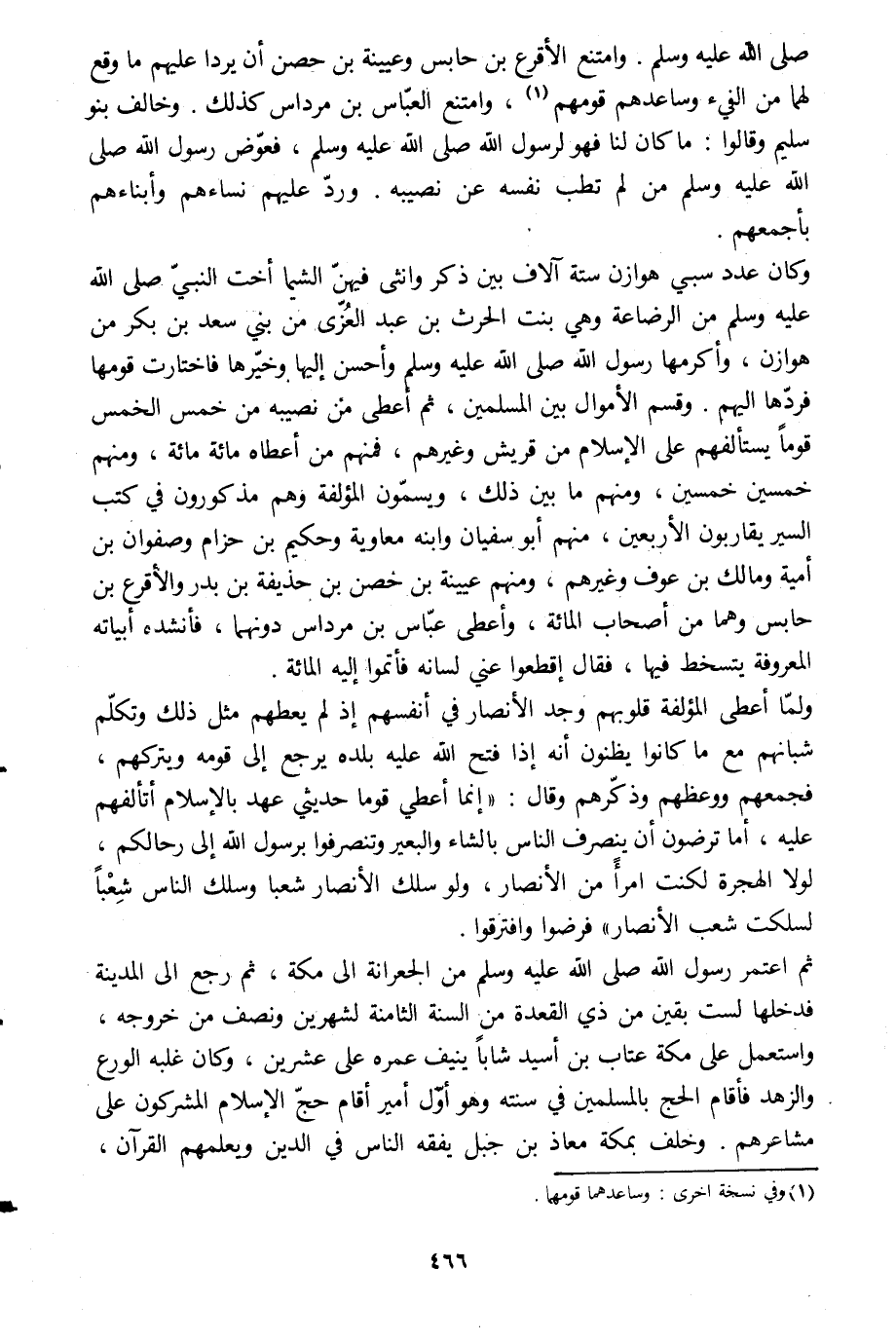صلى الله عليه وسلم. وامتنع الأقرع بن حابس وعيينة بن حصن أن يراد عليهم ما وقع لهما من الفي وساعدهم قومهم [1] ، وامتنع العبّاس بن مرداس كذلك. وخالف بنو سليم وقالوا: ما كان لنا فهو لرسول الله صلى الله عليه وسلم، فعوّض رسول الله صلى الله عليه وسلم من لم تطب نفسه عن نصيبه. وردّ عليهم نساءهم وأبناءهم بأجمعهم.