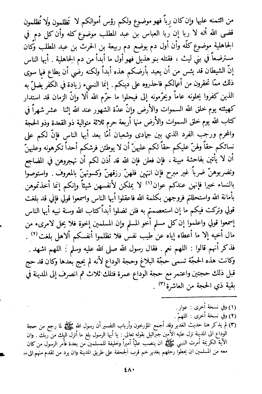 من ائتمنه عليها وإن كان ربا فهو موضوع ولكم رءوس أموالكم لا تظلمون ولا تظلمون قضى الله أنه لا ربا إن ربا العباس بن عبد المطلب موضوع كله وأن كل دم في الجاهلية موضوع كلّه وأن أول دم يوضع دم ربيعة بن الحرث بن عبد المطلب وكان مسترضعا في بني ليث، فقتله بنو هذيل فهو أول ما أبدأ من دم الجاهلية. أيها الناس إنّ الشيطان قد يئس من أن يعبد بأرضكم هذه أبدا ولكنه رضي أن يطاع فيما سوى ذلك ممّا تحقرون من أعمالكم فاحذروه على دينكم. إنما النسيء زيادة في الكفر يضلّ به الذين كفروا يحلونه عاما ويحرّمونه إلى فيحلوا ما حرّم الله إلا وإنّ الزمان قد استدار كهيئته يوم خلق الله السموات والأرض وإنّ عدّة الشهور عند الله اثنا عشر شهرا في كتاب الله يوم خلق السموات والأرض منها أربعة حرم ثلاثة متوالية ذو القعدة وذو الحجة والمحرم ورجب الفرد الّذي بين جمادى وشعبان أمّا بعد أيها الناس فإنّ لكم على نسائكم حقا ولهنّ عليكم حقا لكم عليهنّ أن لا يوطئن فرشكم أحدا تكرهونه وعليهنّ أن لا يأتين بفاحشة مبينة، فإن فعلن فإن الله قد أذن لكم أن تهجروهن في المضاجع وتضربوهنّ ضربا غير مبرح فإن انتهين فلهنّ رزقهنّ وكسوتهنّ بالمعروف. واستوصوا بالنساء خيرا فإنّهنّ عندكم عوان [1] لا يملكن لأنفسهن شيئا وإنكم إنما أخذتموهنّ بأمانة الله واستحللتم فروجهن بكلمة الله فاعقلوا أيها الناس واسمعوا قولي فإنّي قد بلغت قولي وتركت فيكم ما إن استعصمتم به فلن تضلوا أبدا كتاب الله وسنة نبيه أيها الناس اسمعوا قولي واعلموا إن كل مسلم أخو المسلم وإن المسلمين إخوة فلا يحل لامرئ من مال أخيه إلا ما أعطاه إياه عن طيب نفس فلا تظلموا أنفسكم ألا هل بلغت [2] .