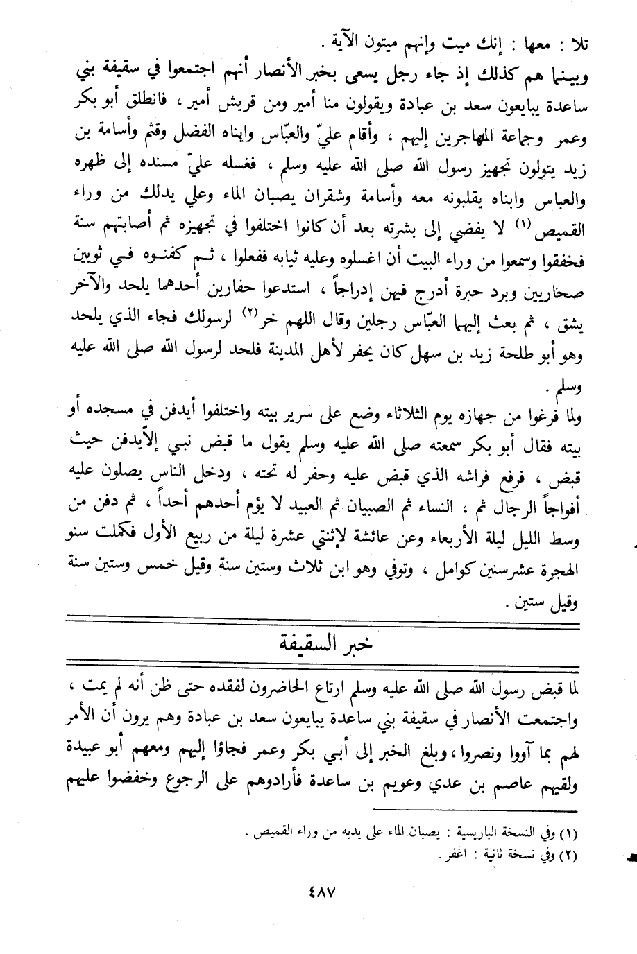 وبينما هم كذلك إذا جاء رجل يسعى بخبر الأنصار أنهم اجتمعوا في سقيفة بني ساعدة يبايعون سعد بن عبادة ويقولون منا أمير ومن قريش أمير، فانطلق أبو بكر وعمر وجماعة المهاجرين إليهم، وأقام عليّ والعبّاس وابناه الفضل وقثم وأسامة بن زيد يتولون تجهيز رسول الله صلى الله عليه وسلم، فغسله عليّ مسندة إلى ظهره والعباس وابناه يقلبونه معه وأسامة وشقران يصبان الماء وعلي يدلك من وراء القميص [1] لا يفضي إلى بشرته بعد أن كانوا اختلفوا في تجهيزه ثم أصابتهم سنة فخفقوا وسمعوا من وراء البيت أن اغسلوه وعليه ثيابه ففعلوا، ثم كفنوه في ثوبين صحاريين وبرد حبرة أدرج فيهن إدراجا، استدعوا حفارين أحدهما يلحد والآخر يشق، ثم بعث إليهما العبّاس رجلين وقال اللَّهمّ خر [2] لرسولك فجاء الّذي يلحد وهو أبو طلحة زيد بن سهل كان يحفر لأهل المدينة فلحد لرسول الله صلى الله عليه وسلم.