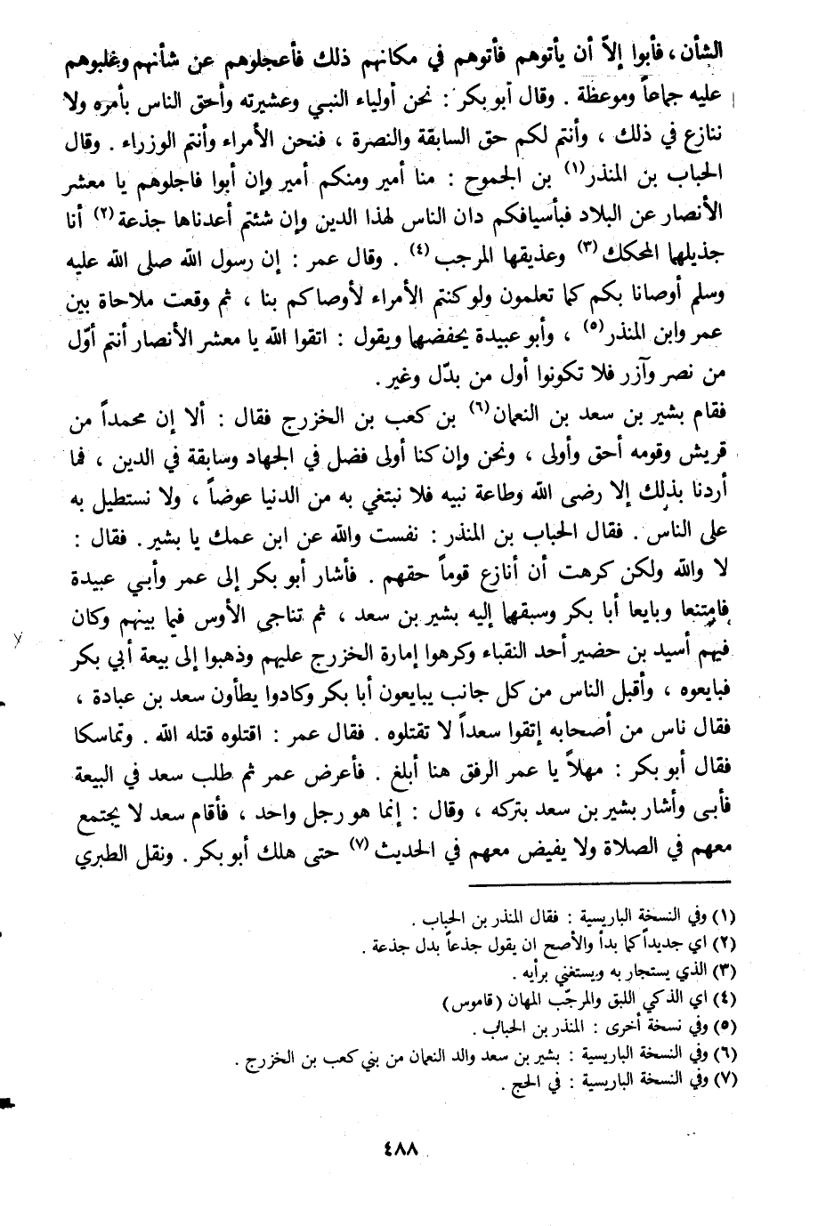 الشأن، فأبوا الّا أن يأتوهم فأتوهم في مكانهم ذلك فأعجلوهم عن شأنهم وغلبوهم عليه جماعا وموعظة. وقال أبو بكر: نحن أولياء النبي وعشيرته وأحق الناس بأمره ولا ننازع في ذلك، وأنتم لكم حق السابقة والنصرة، فنحن الأمراء وأنتم الوزراء. وقال الحباب بن المنذر [1] بن الجموع: منا أمير ومنكم أمير وإن أبو فاجلوهم يا معشر الأنصار عن البلاد فبأسيافكم دان الناس لهذا الدين وإن شئتم أعددناها جذعة [2] أنا جذيلهما المحكك [3] وعذيقها المرجب [4] . وقال عمر: إن رسول الله صلى الله عليه وسلم أوصانا لكم كما تعلمون ولو كنتم الأمراء لأوصاكم بنا، ثم وقعت ملاحاة بين عمر وابن المنذر [5] ، وأبو عبيدة يحفضهما ويقول: اتقوا الله يا معشر الأنصار أنتم أوّل من نصر وآزر فلا تكونوا أول من بدّل وغير.